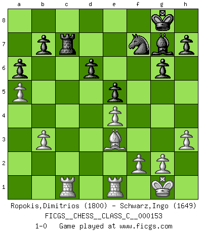 Last move : 1-0 2010 November 13 18:30:5 [Event "FICGS__CHESS__CLASS_C__000153"] [Site "FICGS"] [Date "2010.08.07"] [Round "1"] [White "Ropokis,Dimitrios"] [Black "Schwarz,Ingo"] [Result "1-0"] [WhiteElo "1800"] [BlackElo "1649"] 1.e4 g6 2.d4 Bg7 3.Nf3 f6 4.Bc4 Nh6 5.O-O Nf7 6.Nc3 O-O 7.Re1 d6 8.h3 Nc6 9.Qe2 e5 10.dxe5 Ncxe5 11.Nxe5 fxe5 12.Be3 c6 13.a4 Qe7 14.b4 Be6 15.b5 Rfd8 16.Rad1 Rd7 17.a5 Bxc4 18.Qxc4 cxb5 19.Nxb5 a6 20.Nc3 Rc7 21.Qb3 Rac8 22.Nd5 Qe6 23.Nxc7 Qxb3 24.cxb3 Rxc7 25.Rc1 1-0 Robatsch (Modern) defense Kingside Castling by player White (move 5) Kingside Castling by player Black (move 6) Player White won this chess game. Follow this game move after move (download)The tactician knows what to do when there is something to do; whereas the strategian knows what to do when there is nothing to do. (Gerald Abrahams) Wenn ich gewinne bin ich ein Genie. Wenn nicht, dann bin ich keines. (Robert James Fischer) Ayuda a tus piezas para que ellas te puedan ayudar. (Paul Morphy) Ne tendez aucun piège pour le plaisir ! Ne jouez rien dans l'espoir que l'adversaire réagisse de façon stupide ! Prenez toujours pour acquis que l'adversaire va trouver le meilleur coup ! Ne jouez jamais de coup dans l'espoir que l'adversaire ne voie pas la menace ! Chacun de vos coups doit améliorer la position d'une façon ou d'une autre. Some people are so afraid to die that they never begin to live. (Henry Van Dyke)