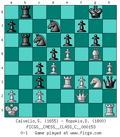 Last move : 0-1 2010 December 28 22:56:10 [Event "FICGS__CHESS__CLASS_C__000153"] [Site "FICGS"] [Date "2010.08.07"] [Round "1"] [White "Calvello,Simone"] [Black "Ropokis,Dimitrios"] [Result "0-1"] [WhiteElo "1655"] [BlackElo "1800"] 1.e4 c6 2.d4 d5 3.e5 Bf5 4.Nc3 e6 5.g4 Bg6 6.Nge2 h6 7.Nf4 Bh7 8.Bd3 Bxd3 9.Qxd3 Ne7 10.Be3 Nd7 11.O-O-O c5 12.Rhe1 c4 13.Qd2 Nc6 14.Kb1 Bb4 15.Nh5 g6 16.Ng3 Qh4 17.g5 hxg5 18.Bxg5 Bxc3 19.bxc3 Qh3 20.Re3 Qg4 21.h4 b5 22.Rg1 b4 23.Qc1 O-O 24.f3 Qh3 25.Qd2 Rab8 26.Ka1 Rb6 27.Qf2 bxc3 28.Rh1 Rfb8 0-1 This chess game has been lost on time (started : 2010.08.07 8:35:47) Caro-Kann : Advance variation Queenside Castling by player White (move 11) Kingside Castling by player Black (move 23) Player Black won this chess game. Follow this game move after move (download)I like to say that Bobby Fischer was the greatest player ever. But what made Fischer a genius was his ability to blend an American freshness and pragmatism with Russian ideas about strategy. (Bruce Pandolfini) Das typische an einem Großmeister ist, daß er eine gewonnene Position schnell und schmerzlos gewinnt. (Irving Chernev) Aquellos que dicen entender al Ajedrez, no entienden nada. (Robert Hubner) La solitude du joueur d'Echecs à l'approche du mat est semblable à celle du condamné. (Francis Szpiner) If you lose the game you should win the analysis! (Proverb)