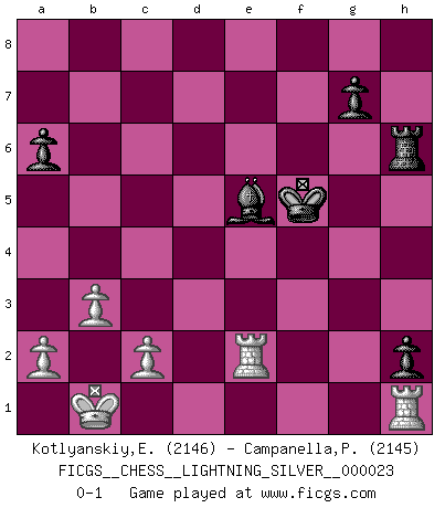 Last move : 0-1 2010 August 7 22:6:39 [Event "FICGS__CHESS__LIGHTNING_SILVER__000023"] [Site "FICGS"] [Date "2010.08.07"] [Round "1"] [White "Kotlyanskiy,Edward"] [Black "Campanella,Paul"] [Result "0-1"] [WhiteElo "2146"] [BlackElo "2145"] 1.e4 c5 2.Nf3 d6 3.d4 cxd4 4.Nxd4 Nf6 5.Nc3 a6 6.Bg5 e6 7.f4 Nbd7 8.Qe2 h6 9.Bh4 Qc7 10.O-O-O Be7 11.g4 b5 12.e5 dxe5 13.fxe5 Qxe5 14.Qf3 Qb8 15.Bg2 Ra7 16.Nc6 Bb7 17.Qf2 Bxc6 18.Bxc6 Rc7 19.Bg3 Qc8 20.Bxc7 Qxc7 21.Bxd7+ Nxd7 22.Kb1 Nf6 23.h4 b4 24.Ne2 Nxg4 25.Qf3 Ne5 26.Qa8+ Bd8 27.Rd4 O-O 28.Rxb4 Be7 29.Qb7 Qc5 30.Rb6 Qf2 31.Nc3 Nf3 32.Rd1 Nd2+ 33.Ka1 Nc4 34.Rc6 Na5 35.Qb6 Qxb6 36.Rxb6 Ra8 37.Ne4 Bxh4 38.b3 Bd8 39.Rbd6 Be7 40.Rd7 Kf8 41.Rc7 Bd8 42.Rc3 h5 43.Kb1 h4 44.Rg1 Nb7 45.Rc4 f6 46.Rd1 f5 47.Rb4 fxe4 48.Rxb7 Bf6 49.Rb4 e3 50.Re4 Kf7 51.Rd7+ Kg6 52.Rxe6 h3 53.Rd1 h2 54.Rxe3 Rh8 55.Rg3+ Kf5 56.Rf1+ Ke4 57.Rh1 Be5 58.Rg2 Rh6 59.Re2+ Kf5 0-1 Sicilian : Najdorf, 7.f4 Queenside Castling by player White (move 10) Kingside Castling by player Black (move 27) Player Black won this chess game. Follow this game move after move (download)When the Chess game is over, the Pawn and the King go back to the same box. (Irish saying) Ich bewundere Kasparows phantasievolle Angriffssiege aus den Achtzigern und Neunzigern, aber wenn man sie mit dem Computer überprüft, nimmt der Computer in jeder zweiten Partie die Opfer an, verteidigt sich und gewinnt. (Vladimir Kramnik) Bobby Fischer es el mas grande genio de Ajedrez de todos los tiempos. (Alexander Kotov) Plusieurs personnes se sont demandées comment Tal faisait pour gagner... En fait, c'est très simple ! Il met ses pièces au centre de l'échiquier et les sacrifie quelque part ! (David Bronstein) Vladimir Ras-Putin is still alive... He is also a good actor, I saw him in the Lord of the Rings. (Rodolfo d'Ettorre)