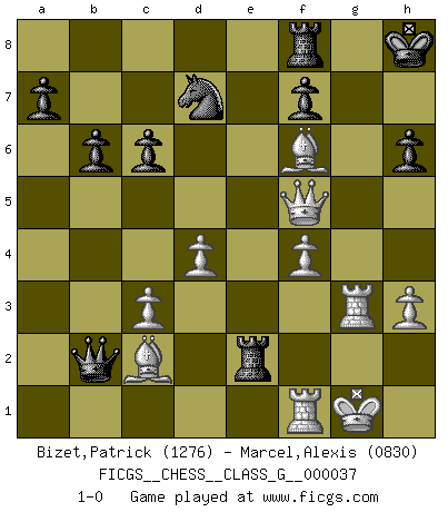 Last move : 1-0 2010 September 10 8:59:20 [Event "FICGS__CHESS__CLASS_G__000037"] [Site "FICGS"] [Date "2010.08.08"] [Round "1"] [White "Bizet,Patrick"] [Black "Marcel,Alexis"] [Result "1-0"] [WhiteElo "1276"] [BlackElo "0830"] 1.e4 e5 2.Nf3 Nf6 3.Nxe5 d6 4.Nf3 Nxe4 5.d3 Nf6 6.d4 d5 7.c4 c6 8.Nc3 dxc4 9.Bxc4 Bb4 10.O-O O-O 11.Bg5 Bg4 12.a3 Bxc3 13.bxc3 Nbd7 14.Qd3 Qc7 15.Bb3 h6 16.Bh4 Bxf3 17.Qxf3 g5 18.Bg3 Qb6 19.Rab1 Qd8 20.Qf5 Kg7 21.Bc2 b6 22.f4 g4 23.h3 gxh3 24.gxh3 Qe7 25.Rbe1 Qxa3 26.Re3 Rae8 27.Ref3 Qb2 28.Bh4 Re2 29.Rg3+ Kh8 30.Bxf6+ 1-0 Petrov : French attack Kingside Castling by player White (move 10) Kingside Castling by player Black (move 10) Player White won this chess game. Follow this game move after move (download)We don't really know how the game was invented, though there are suspicions. As soon as we discover the culprits, we'll let you know. (Bruce Pandolfini) Ich würde die 30 stärksten Spieler der USA im Simultanspiel besiegen. (José Raúl Capablanca) Existen dos clases de sacrificios: los correctos y los míos. (Mikhail Tal) Ce qui est bien, c'est d'avoir tout un tas de pièces en prise : l'adversaire ne peut en prendre qu'une à la fois. Cité par Thierry Audin. I have opinions of my own - strong opinions - but I don't always agree with them. (George Bush)