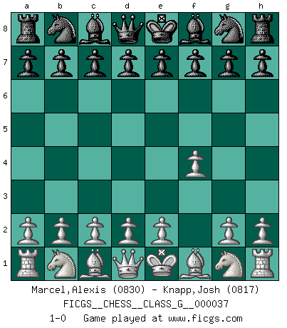 Last move : 1-0 2010 September 17 20:57:11 [Event "FICGS__CHESS__CLASS_G__000037"] [Site "FICGS"] [Date "2010.08.08"] [Round "1"] [White "Marcel,Alexis"] [Black "Carlo,John"] [Result "1-0"] [WhiteElo "0830"] [BlackElo "0817"] 1.f4 1-0 This chess game has been lost on time (started : 2010.08.08 0:20:56) Bird's Opening Player White won this chess game. Follow this game move after move (download)First-class players lose to second-class players because second-class players sometimes play a first-class game. (Siegbert Tarrasch) Moralische Siege zählen nicht. (Savielly Grigorievitsch Tartakower) Desconfianza es la característica mas necesaria de un jugador de Ajedrez. (Siegbert Tarrasch) Les Echecs, c'est l'art de la guerre sans les charniers, c'est la résurrection des morts tombés au champ d'honneur, l'espoir perpétuel, la suprématie de l'intelligence sur la force, la culture de l'esprit. (F. Szpiner) Life is pleasant. Death is peaceful. It's the transition that's troublesome. (Isaac Asimov)