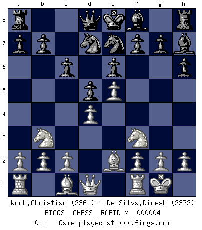 Last move : 0-1 2007 January 2 17:0:46 [Event "FICGS__CHESS__RAPID_M__000004"] [Site "FICGS"] [Date "2006.11.16"] [Round "1"] [White "Koch,Christian"] [Black "De Silva,Dinesh"] [Result "0-1"] [WhiteElo "2361"] [BlackElo "2372"] 1.e4 c6 2.d4 d5 3.e5 Bf5 4.Nf3 e6 5.Be2 Nd7 6.O-O h6 7.Nbd2 Ne7 8.Nb3 Bh7 0-1 Caro-Kann : Advance variation Kingside Castling by player White (move 6) Player Black won this chess game. Follow this game move after move (download)When you are lonely, when you feel yourself an alien in the world, play Chess. This will raise your spirits and be your counselor in war. (Aristotle) Wie bekannt hörte Morphy 1859 auf, Schach zu spielen. Seine Enttäuschung galt nicht so sehr dem Schach, wie den Schachspielern. (Robert James Fischer) La enorme capacidad mental, en la que sin ella no puede un jugador de Ajedrez existir, es demasiado requerida por el Ajedrez al grado de que nunca podrá liberar su mente de este juego. (Albert Einstein) La conception d'un plan est le processus par lequel un joueur exploite les avantages de sa position tout en s'efforçant d'en réduire au minimum les inconvénients. Afin de garantir le succès, un plan doit toujours se fonder sur un diagnostic objectif des particularités d'une position. La conception d'un plan est d'autant plus difficile que la position est équilibrée, et grandement facilitée lorsqu'il n'existe qu'un seul plan susceptible de répondre aux exigences de la position. (Harry Golombek) Creativity involves breaking out of established patterns in order to look at things in a different way. (Edward De Bono)