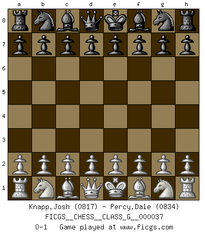 Last move : 0-1 2010 September 17 8:55:14 [Event "FICGS__CHESS__CLASS_G__000037"] [Site "FICGS"] [Date "2010.08.08"] [Round "1"] [White "Carlo,John"] [Black "Percy,Dale"] [Result "0-1"] [WhiteElo "0817"] [BlackElo "0834"] 0-1 This chess game has been lost on time (started : 2010.08.08 0:20:56) Player Black won this chess game. Follow this game move after move (download)Do you realize Fischer almost never has any bad pieces? He exchanges them, and the bad pieces remain with his opponents. (Yuri Balashov) Obwohl ich alt bin, darf mir niemand den Finger in den Mund stecken, sonst beisse ich. (Wilhelm Steinitz) Yo creo que el Ajedrez posee una magia que es también una ayuda en la edad avanzada. Una rodilla reumática es olvidada durante una partida de Ajedrez y otros eventos pueden parecer algo sin importancia comparada a una catástrofe en el tablero de Ajedrez. (Vlastimil Hort) On n'a jamais que l'âge auquel on a commence à jouer aux échecs car après on cesse de vieillir. (Capablanca) Good luck. You're gonna need it. (Han Solo in Star Wars ep.6)