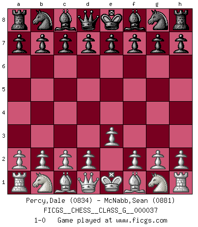 Last move : 1-0 2010 September 17 8:55:14 [Event "FICGS__CHESS__CLASS_G__000037"] [Site "FICGS"] [Date "2010.08.08"] [Round "1"] [White "Percy,Dale"] [Black "McNabb,Sean"] [Result "1-0"] [WhiteElo "0834"] [BlackElo "0881"] 1.e3 1-0 This chess game has been lost on time (started : 2010.08.08 0:20:56) Van't Kruijs Opening Player White won this chess game. Follow this game move after move (download)There are two types of sacrifices: correct ones and mine. (Mikhail Tal) Gewöhnliche Menschen denken nur daran, wie sie ihre Zeit verbringen. Ein intelligenter Mensch versucht, sie auszunutzen. (Arthur Schopenhauer) No es suficiente ser un buen jugador, se debe también de jugar bién. (Siegbert Tarrasch) Je menace de comprendre la position. (Anonyme) Perhaps the current trend of many chess professionals taking up the more lucrative pastime of poker is not a wholly negative one. It may not be too late for humans to relearn how to take risks in order to innovate and thereby maintain the advanced lifestyles we enjoy. And if it takes a poker-playing supercomputer to remind us that we can't enjoy the rewards without taking the risks, so be it. (The Chess Master and the Computer, by Garry Kasparov - 2010)