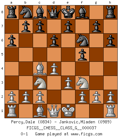 Last move : 0-1 2010 October 27 10:28:55 [Event "FICGS__CHESS__CLASS_G__000037"] [Site "FICGS"] [Date "2010.08.08"] [Round "1"] [White "Percy,Dale"] [Black "Jankovic,Mladen"] [Result "0-1"] [WhiteElo "0834"] [BlackElo "0989"] 1.e3 f5 2.Nf3 d6 3.d4 h6 4.Nc3 Nf6 5.Bc4 a6 0-1 This chess game has been lost on time (started : 2010.08.08 0:20:56) Van't Kruijs Opening Player Black won this chess game. Follow this game move after move (download)I won't play with you anymore. You have insulted my friend. - When an opponent cursed himself for a blunder. (Miguel Najdorf) Warum muß ich gegen diesen IDIOTEN verlieren? (Aaron Nimzowitsch) Si tu oponente te ofrece un empate, trata de averiguar porque piensa él que esta en una posición peor. (Nigel Short) Echiquier : carré parfait, comme la Jérusalem nouvelle décrite par l'auteur de l'Apocalypse, huit cases sur huit, exaltation du chiffre 4, symbole du cosmos aux quatre horizons... où le noir et le blanc, l'ombre et la lumière, le mal et le bien s'entremêlent et se conjuguent. (Robert Couffignal, Le Gambit du poète) Question: Is 'This statement is paradoxical' a paradoxical statement ? Or is it a meta-paradox ? (Normajean Yates)