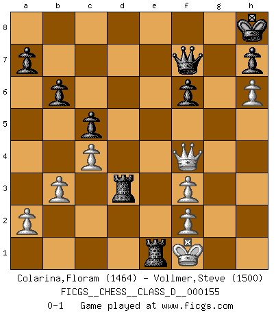 Last move : 0-1 2010 September 11 7:59:2 [Event "FICGS__CHESS__CLASS_D__000155"] [Site "FICGS"] [Date "2010.08.09"] [Round "1"] [White "Colarina,Floram"] [Black "Vollmer,Steve"] [Result "0-1"] [WhiteElo "1464"] [BlackElo "1500"] 1.d4 d5 2.c4 e6 3.Nc3 Nf6 4.Nf3 Be7 5.e3 O-O 6.Bd3 Nbd7 7.O-O c6 8.e4 dxe4 9.Nxe4 Nxe4 10.Bxe4 Nf6 11.Bc2 b6 12.Re1 Bb7 13.Qe2 Re8 14.Bg5 Qc7 15.h3 Rad8 16.b3 c5 17.d5 Bd6 18.Bxf6 gxf6 19.Qd3 f5 20.Qc3 exd5 21.Qf6 f4 22.Qg5+ Kh8 23.Qf6+ Kg8 24.h4 d4 25.h5 Bxf3 26.h6 Be5 27.Qg5+ Kh8 28.Qf5 f6 29.gxf3 Qf7 30.Kf1 d3 31.Bxd3 Bxa1 32.Rxa1 Re5 33.Qxf4 Rxd3 34.Re1 Rxe1+ 0-1 QGD : 4.Nf3 Kingside Castling by player Black (move 5) Kingside Castling by player White (move 7) Player Black won this chess game. Follow this game move after move (download)If a ruler does not understand Chess, how can he rule over a kingdom ? (King Khusros II) Pläne sind die Träume des Verständigen. (Ernst Freiherr von Feuchtersleben) El Ajedrez es el juego mas altamente simbólico, pero las agresiones estan por lo tanto aún mas francamente representadas en la partida. Tal vez comenzo como un juego de guerra; Algo como la representación de una batalla en miniatura entre las fuerzas de dos reinos. (Karl Meninger) Le temps de noter son nom sur la feuille de partie, j'étais déjà en zeitnot ! D'un modeste amateur apparié lors de la première ronde d'un open contre le grand-maître Azmaïparashvili. Hardware: the parts of a computer that can be kicked. (Jeff Persis)