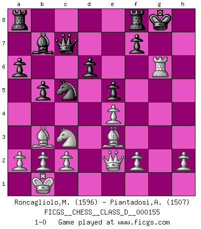 Last move : 1-0 2010 October 26 2:27:10 [Event "FICGS__CHESS__CLASS_D__000155"] [Site "FICGS"] [Date "2010.08.09"] [Round "1"] [White "Roncagliolo,Marco"] [Black "Piantadosi,Angelo"] [Result "1-0"] [WhiteElo "1596"] [BlackElo "1507"] 1.e4 c5 2.Nf3 d6 3.d4 cxd4 4.Nxd4 Nf6 5.Nc3 a6 6.Bc4 e6 7.Be3 Be7 8.Bb3 Nc6 9.Qe2 O-O 10.O-O-O Nxd4 11.Bxd4 b5 12.g4 Bb7 13.g5 Nd7 14.Rhg1 Bxg5+ 15.Kb1 Qc7 16.Rxg5 e5 17.Be3 Nc5 18.Rdg1 g6 19.Rxg6+ hxg6 20.Rxg6+ 1-0 Sicilian : Najdorf, Lipnitzky attack Kingside Castling by player Black (move 9) Queenside Castling by player White (move 10) Player White won this chess game. Follow this game move after move (download)Even the laziest King flees wildly in the face of a double check ! (Aaron Nimzowitsch) Je älter ich werde, um so mehr schätze ich die Bauern. (Paul Keres) El poder defensivo de una pieza clavada, solamente es imaginario. (Aaron Nimzovich) Les Echecs, c'est l'art de la guerre sans les charniers, c'est la résurrection des morts tombés au champ d'honneur, l'espoir perpétuel, la suprématie de l'intelligence sur la force, la culture de l'esprit. (F. Szpiner) Rules and bones are meant to be broken. (Anonymous)