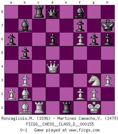 Last move : 0-1 2011 January 4 22:35:25 [Event "FICGS__CHESS__CLASS_D__000155"] [Site "FICGS"] [Date "2010.08.09"] [Round "1"] [White "Roncagliolo,Marco"] [Black "Martinez Camacho,Victor Hugo"] [Result "0-1"] [WhiteElo "1596"] [BlackElo "1479"] 1.e4 e5 2.Nf3 Nc6 3.Bb5 a6 4.Ba4 Nf6 5.O-O Be7 6.Re1 b5 7.Bb3 O-O 8.c3 d6 9.h3 Na5 10.Bc2 c5 11.d3 Bb7 12.Nbd2 Nc6 13.Nf1 Re8 14.d4 cxd4 15.cxd4 exd4 16.Nxd4 Rc8 17.Be3 Ne5 18.Ng3 Nc4 19.Bc1 h6 20.b3 Ne5 21.Bb2 Bf8 22.Rc1 Nc6 23.Bb1 Nxd4 24.Qxd4 Kh7 25.e5 g6 26.exf6 Rxe1+ 0-1 This chess game has been lost on time (started : 2010.08.09 20:30:46) Ruy Lopez : Closed, 7...O-O Kingside Castling by player White (move 5) Kingside Castling by player Black (move 7) Player Black won this chess game. Follow this game move after move (download)To avoid losing a piece, many a person has lost the game. (Savielly Tartakover) Später, ... hatte ich zunehmend Erfolg in entscheidenden Partien. Vielleicht weil ich eine einfache Wahrheit erkannte: nicht nur ich hatte Angst, auch mein Gegner. (Mikhail Nekhemyevich Tal) El Ajedrez se juega con la mente... ¡no con las manos!. (Renaud y Kahn) Des combinaisons [dans le jeu d'échecs] pareilles à des mélodies. Je crois entendre pour ainsi dire la musique des coups... (Vladimir Nabokov) Nobody is always a winner, and anybody who says he is, is either a liar or doesn't play poker. (Amarillo Slim)