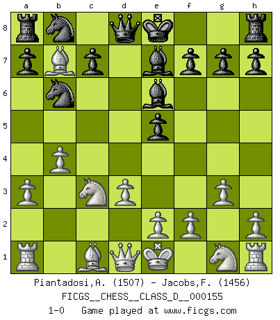 Last move : 1-0 2010 September 2 11:51:6 [Event "FICGS__CHESS__CLASS_D__000155"] [Site "FICGS"] [Date "2010.08.09"] [Round "1"] [White "Piantadosi,Angelo"] [Black "Jacobs,Francois"] [Result "1-0"] [WhiteElo "1507"] [BlackElo "1456"] 1.c4 e5 2.Nc3 Nf6 3.d3 Bb4 4.a3 Be7 5.g3 d5 6.cxd5 Nxd5 7.Bg2 Nb6 8.b4 Be6 9.Bxb7 1-0 English Opening Player White won this chess game. Follow this game move after move (download)All Chess players should have a hobby. (Savielly Tartakower) Gegen einen Schachcomputer zu verlieren ist wie Löcher in den Strümpfen zuhaben. Es ist nicht peinlich, solange man der einzige ist der es weiß. (Anonymous) Bobby solo arroja las piezas y solas caen en las casillas correctas. (Miguel Najdorf ) Mais n'est-ce pas déjà le limiter injurieusement que d'appeler les échecs un jeu? N'est-ce pas aussi une science, un art, ou quelque chose qui, comme le cercueil de Mahomet entre ciel et terre, est suspendu entre l'un et l'autre, et qui réunit un nombre incroyable de contraires ? (Stefan Zweig) Computers are like Old Testament gods; lots of rules and no mercy. (Joseph Campbell)