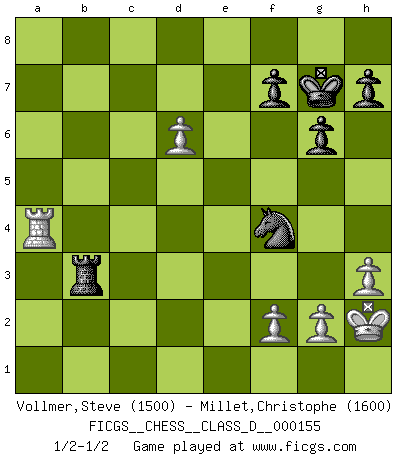 Last move : 1/2-1/2 2010 August 14 21:16:31 [Event "FICGS__CHESS__CLASS_D__000155"] [Site "FICGS"] [Date "2010.08.09"] [Round "1"] [White "Vollmer,Steve"] [Black "Millet,Christophe"] [Result "1/2-1/2"] [WhiteElo "1500"] [BlackElo "1600"] 1.d4 d5 2.c4 dxc4 3.e4 b5 4.a4 c6 5.axb5 cxb5 6.b3 cxb3 7.Bxb5+ Bd7 8.Qxb3 Nc6 9.Nf3 g6 10.d5 Nb8 11.Bb2 Nf6 12.Nbd2 a6 13.Bxd7+ Qxd7 14.O-O Bg7 15.Ra5 O-O 16.Rc1 Qd8 17.Rac5 Nbd7 18.Rc7 Ng4 19.Bxg7 Kxg7 20.h3 Ngf6 21.Rb7 Qa5 22.Qc3 Qxc3 23.Rxc3 a5 24.Rb5 a4 25.Ra3 Rfc8 26.e5 Ne8 27.Rb4 Rc1+ 28.Kh2 Nc5 29.Nd4 Nc7 30.d6 exd6 31.exd6 Nd5 32.Rb5 Nf4 33.N2b3 Nxb3 34.Nxb3 Rc3 35.Rb4 Rd3 36.R3xa4 Rxa4 37.Rxa4 Rxb3 1/2-1/2 QGA : 3.e4 Kingside Castling by player White (move 14) Kingside Castling by player Black (move 15) This chess game ended in a draw. Follow this game move after move (download)Examine moves that smite! A good eye for smites is far more important than a knowledge of strategical principles. (Purdy) Ich moechte nie einem Club beitreten, der Leute wie mich als Mitglieder aufnimmt. (Woody Allen) Sin errores no puede haber brillantez. (Emanuel Lasker) Pour se monter efficace, un Cavalier a besoin d'avant-postes ! Les Cavaliers font les meilleurs bloqueurs de pions passés. It's unlucky to be superstitious. (Dave Enteles)