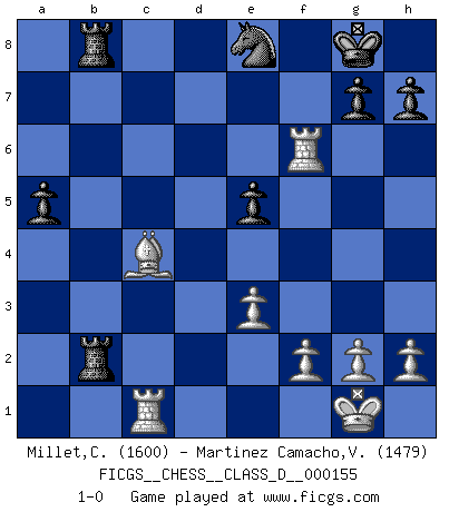 Last move : 1-0 2010 September 9 17:8:39 [Event "FICGS__CHESS__CLASS_D__000155"] [Site "FICGS"] [Date "2010.08.09"] [Round "1"] [White "Millet,Christophe"] [Black "Martinez Camacho,Victor Hugo"] [Result "1-0"] [WhiteElo "1600"] [BlackElo "1479"] 1.d4 Nf6 2.e3 e6 3.Nf3 d5 4.Bd2 Be7 5.Nc3 O-O 6.Qe2 c5 7.dxc5 Bxc5 8.Na4 Bd6 9.Nd4 e5 10.Nb5 Be7 11.c4 dxc4 12.Qxc4 Be6 13.Qc7 Nc6 14.Qxb7 Nb4 15.Rc1 Nxa2 16.Rc7 Bd6 17.Nxd6 Qxd6 18.Rc2 Rfb8 19.Qc6 Qxc6 20.Rxc6 Bd7 21.Ra6 Nb4 22.Bxb4 Rxb4 23.Nc5 Be8 24.Nd3 Rb3 25.Be2 Bb5 26.Rd6 Bxd3 27.Bxd3 Rxb2 28.O-O a5 29.Rc1 Ne8 30.Rd5 f6 31.Bc4 Kf8 32.Rd7 Rab8 33.Rf7+ Kg8 34.Rxf6 1-0 Queen's pawn game Kingside Castling by player Black (move 5) Kingside Castling by player White (move 28) Player White won this chess game. Follow this game move after move (download)Don't even mention losing to me. I can't stand to think of it. (Bobby Fischer) Auf jeden Fall musst du zuerst Rechtsanwalt werden, damit du deine eigenen Interessen und die deiner Familie vertreten kannst. [Brief an seinen Sohn] (José Raúl Capablanca) Si no le temes a Spassky, entonces elimino el elemento del dinero. (Jim Slater) Le profane ne songe pas à la somme de jouissance dont il se prive, qui méconnaît ce jeu aux ressources aussi variées que passionnantes. (Jean-Marie Jeanton-Lamarche) If you don't practice you don't deserve to win. (Andre Agassi)