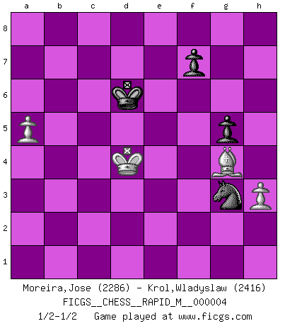 Last move : 1/2-1/2 2007 February 17 0:35:0 [Event "FICGS__CHESS__RAPID_M__000004"] [Site "FICGS"] [Date "2006.11.16"] [Round "1"] [White "Moreira,Jose"] [Black "Krol,Wladyslaw"] [Result "1/2-1/2"] [WhiteElo "2286"] [BlackElo "2416"] 1.e4 e5 2.Nf3 Nc6 3.Bc4 Bc5 4.c3 Nf6 5.d4 exd4 6.cxd4 Bb4+ 7.Nc3 Nxe4 8.O-O Bxc3 9.d5 Bf6 10.Re1 Ne7 11.Rxe4 d6 12.Bg5 Bxg5 13.Nxg5 O-O 14.Qd4 Bf5 15.Re3 Ng6 16.Nf3 Re8 17.Rxe8+ Qxe8 18.Qc3 c5 19.dxc6 bxc6 20.Re1 Qd7 21.Nd4 Ne5 22.Bf1 c5 23.Nb5 Re8 24.Rd1 Re6 25.f4 Ng4 26.Qxc5 Re1 27.Qd5 Rxd1 28.Qxd1 Qe7 29.Qe2 Qd8 30.Qd2 d5 31.h3 Qb6+ 32.Qd4 Ne3 33.Qxb6 axb6 34.Be2 Be4 35.g3 Kf8 36.Kf2 Nc2 37.a3 Ke7 38.Bd1 Kd7 39.Nc3 Nd4 40.Nxe4 dxe4 41.Ke3 Nf5+ 42.Kxe4 Nxg3+ 43.Kd5 Nf1 44.Bg4+ Kc7 45.Kd4 Kd6 46.b4 g6 47.a4 Ng3 48.Kd3 h6 49.Kc4 Nf1 50.Kd4 g5 51.a5 bxa5 52.fxg5 hxg5 53.bxa5 Ng3 1/2-1/2 Giuoco Piano : Greco's attack Kingside Castling by player White (move 8) Kingside Castling by player Black (move 13) 10 pieces endgame at move 52 : White KBPPP , Black KNPPP WHITE : King + 1 Bishop 3 Pawns BLACK : King + 1 Knight 3 Pawns 9 pieces endgame at move 52 : White KBPP , Black KNPPP WHITE : King + 1 Bishop 2 Pawns BLACK : King + 1 Knight 3 Pawns 8 pieces endgame at move 53 : White KBPP , Black KNPP WHITE : King + 1 Bishop 2 Pawns BLACK : King + 1 Knight 2 Pawns This chess game ended in a draw. Follow this game move after move (download)By this measure (on the gap between Fischer & his contemporaries), I consider him the greatest world champion. (Garry Kasparov) Es gibt nur zwei wahre Schachgenies - das andere war Wilhelm Steinitz, der Weltmeister von 1872 bis 1894. (Robert James Fischer) Bobby Fischer es el jugador de Ajedrez mas grande que jamás haya existido. (Ken Smith) Le pion, dans sa simplicité, marche droit devant lui, mais lorsqu'il prend, il le fait obliquement? Ainsi l'homme, tant qu'il reste pauvre, marche dans la droiture et vit honnêtement, mais lorsqu'il recherche les honneurs, il flatte, se parjure et, par les voies obliques, cherche une position supérieure sur l'échiquier du monde. (Jean de Galles) Everybody lies. (Gregory House, House M.D.)