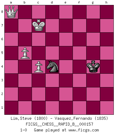 Last move : 1-0 2011 February 2 22:48:30 [Event "FICGS__CHESS__RAPID_B__000157"] [Site "FICGS"] [Date "2010.08.11"] [Round "1"] [White "Lim,Steve"] [Black "Vasquez,Fernando"] [Result "1-0"] [WhiteElo "1800"] [BlackElo "1835"] 1.e4 e5 2.Nf3 Nf6 3.Nxe5 d6 4.Nf3 Nxe4 5.Qe2 Qe7 6.Nc3 Nxc3 7.dxc3 Qxe2+ 8.Bxe2 Nc6 9.Be3 Be7 10.O-O-O O-O 11.b3 Bd7 12.Kb2 Rfe8 13.Rhe1 Bf6 14.Nd4 Re7 15.Bf3 Rae8 16.Nb5 Rc8 17.Nxa7 Rxe3 18.Rxe3 Nxa7 19.Bxb7 g6 20.Bxc8 Nxc8 21.a4 Kf8 22.a5 Bb5 23.g4 Ne7 24.f4 h6 25.Ka3 Nc6 26.h3 g5 27.fxg5 Bxg5 28.R3e1 Bh4 29.Rg1 Ne5 30.Rgf1 Bxf1 31.Rxf1 Ke7 32.a6 Nc6 33.b4 Na7 34.c4 Bf6 35.b5 Bd4 36.Rf5 Kf8 37.g5 hxg5 38.Rxg5 f6 39.Rg4 Bc5+ 40.Kb3 Kf7 41.h4 f5 42.Rf4 Kg6 43.Kc3 Be3 44.h5+ Kg5 45.Rf3 Bc5 46.h6 Kxh6 47.Rxf5 Kg7 48.Rf1 Nc8 49.Rf5 Na7 50.Kd3 Nc8 51.Ke4 Ba7 52.c5 Bxc5 53.Rxc5 dxc5 54.Kd5 c4 55.Kxc4 Kf6 56.Kc5 Kf5 57.c4 Kg4 58.Kc6 Ne7+ 59.Kxc7 Nf5 60.a7 Nd4 61.a8Q 1-0 Petrov : Cozio (Lasker) attack Queenside Castling by player White (move 10) Kingside Castling by player Black (move 10) 10 pieces endgame at move 52 : White KRPPP , Black KBNPP WHITE : King + 1 Rook 3 Pawns BLACK : King + 1 Bishop 1 Knight 2 Pawns 9 pieces endgame at move 53 : White KRPPP , Black KNPP WHITE : King + 1 Rook 3 Pawns BLACK : King + 1 Knight 2 Pawns 8 pieces endgame at move 53 : White KPPP , Black KNPP WHITE : King + 3 Pawns BLACK : King + 1 Knight 2 Pawns 7 pieces endgame at move 55 : White KPPP , Black KNP WHITE : King + 3 Pawns BLACK : King + 1 Knight 1 Pawn 6 pieces endgame at move 59 : White KPPP , Black KN WHITE : King + 3 Pawns BLACK : King + 1 Knight Promotion Queen by player White (move 61) Player White won this chess game. Follow this game move after move (download)Kasparov : J'adoube , Ivanchuk : S'il vous plaît ! (Garry Kasparov & Vassily Ivanchuk, Linares 1997) Es hat in meinem Leben Zeiten gegeben, da ich sehr nahe daran war zu glauben, daß ich auch nicht eine einzige Schachpartie verlieren könnte. (José Raúl Capablanca) Morphy probablemente fue el genio más grande de todos. (Bobby Fischer) Il vaut toujours mieux jouer un plan faux de façon logique que de n'avoir pas de plan du tout. (Victor Kortchnoï) There is a computer disease that anybody who works with computers knows about. It's a very serious disease and it interferes completely with the work. The trouble with computers is that you 'play' with them ! (Richard P. Feynman)
