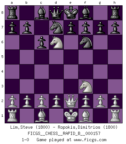 Last move : 1-0 2010 August 13 12:25:20 [Event "FICGS__CHESS__RAPID_B__000157"] [Site "FICGS"] [Date "2010.08.11"] [Round "1"] [White "Lim,Steve"] [Black "Ropokis,Dimitrios"] [Result "1-0"] [WhiteElo "1800"] [BlackElo "1800"] 1.e4 c6 2.Nf3 d5 3.Nc3 dxe4 4.Nxe4 Nd7 5.Qe2 Ngf6 6.Nd6+ 1-0 Caro-Kann defense Player White won this chess game. Follow this game move after move (download)One bad move nullifies forty good ones. (Horowitz) Der beste Spieler in einem Turnier gewinnt es nie. Er landet auf Platz zwei oder drei. (Siegbert Tarrasch) ¿Que sería del Ajedrez sin errores graciosos?. (Kurt Richter) On entre au jeu d'Echecs comme on entre en Religion. Pour le joueur d'Echecs, la partie d'Echecs c'est l'office, la messe, le défilé du 1er Mai, le dépôt de gerbe au Monument aux Morts. C'est un drame sacré. (Michel Roos) The problem with troubleshooting is that trouble shoots back. (Anonymous)