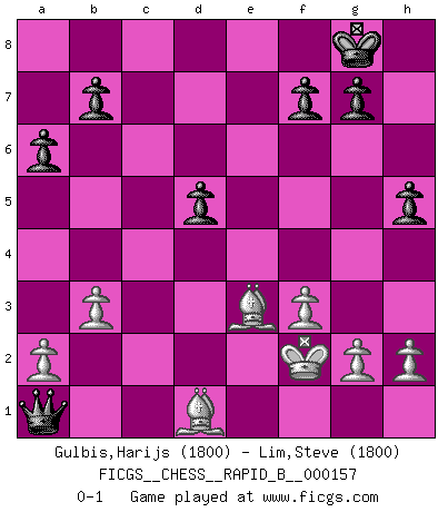 Last move : 0-1 2010 September 4 23:18:47 [Event "FICGS__CHESS__RAPID_B__000157"] [Site "FICGS"] [Date "2010.08.11"] [Round "1"] [White "Gulbis,Harijs"] [Black "Lim,Steve"] [Result "0-1"] [WhiteElo "1800"] [BlackElo "1800"] 1.e4 e6 2.d4 d5 3.Nd2 c5 4.exd5 exd5 5.Ngf3 Nf6 6.Bb5+ Bd7 7.Qe2+ Be7 8.dxc5 O-O 9.Nb3 Re8 10.Be3 a6 11.Bd3 Ba4 12.Nfd4 Bxb3 13.Nxb3 Nbd7 14.O-O Nxc5 15.Nxc5 Bxc5 16.Bxc5 Rxe2 17.Bxe2 Qc7 18.Bd4 Qxc2 19.Bf3 Ne4 20.Rfe1 Qa4 21.Red1 Rc8 22.Be3 Qb5 23.Bg4 Rc2 24.Bf5 h5 25.b3 Qc6 26.f3 Nc3 27.Bxc2 Nxd1 28.Bxd1 Qc3 29.Kf2 Qxa1 0-1 French : Tarrasch, Open, 4.ed ed Kingside Castling by player Black (move 8) Kingside Castling by player White (move 14) Player Black won this chess game. Follow this game move after move (download)When your house is on fire, you can't be bothered with the neighbors. Or, as we say in Chess, if your King is under attack you don't worry about losing a Pawn on the Queen's side. (Gary Kasparov) Fischer ist das größte Genie, das je vom Schachhimmel heruntergestiegen ist. (Mikhail Nekhemyevich Tal) El Peón aislado arroja penumbra sobre todo el tablero. (Aaron Nimzovich) Je crois qu'il existe des manières très spécifiques de jouer efficacement contre une machine. Evidemment, nous n'avons aucune chance en technique pure, parce que l'ordinateur calcule de manière parfaite. Mais lorsque nous faisons appel à notre cerveau, en utilisant l'intuition et la compréhension, alors nous restons beaucoup plus forts. (Anatoli Karpov) . 'gn is not allowed in chess unless n is an integer between 1 and 8 inclusive, where 1 and 8 are to interpreted as the standard numerals standing for integers in the ordered real-closed field R, with the *canonical* ordering. (As opposed to, say, an integer in the domain Z[2+i*sqrt(5)] or an integer in some exotic Grothendieck topos). (Normajean Yates)
