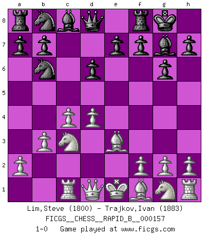 Last move : 1-0 2010 September 20 9:1:0 [Event "FICGS__CHESS__RAPID_B__000157"] [Site "FICGS"] [Date "2010.08.11"] [Round "1"] [White "Lim,Steve"] [Black "Trajkov,Ivan"] [Result "1-0"] [WhiteElo "1800"] [BlackElo "1883"] 1.e4 Nf6 2.e5 Nd5 3.c4 Nb6 4.d4 d6 5.exd6 cxd6 6.Nc3 g6 7.Be3 Bg7 8.Rc1 O-O 9.b3 1-0 This chess game has been lost on time (started : 2010.08.11 0:31:50) Alekhine's defense Kingside Castling by player Black (move 8) Player White won this chess game. Follow this game move after move (download)You sit at the board and suddenly your heart leaps. Your hand trembles to pick up the piece and move it. But what Chess teaches you is that you must sit there calmly and think about whether it's really a good idea and whether there are other better ideas. (Stanley Kubrick) Schach ist ein schwarz-weisser Dschungel. (Garry Kasparov) Peones: ellos son el alma de esta partida, solos forman el ataque y la defensa. (Philidor) Ce n'est pas pour s'amuser qu'il joue aux échecs : il célèbre un culte. (Vladimir Nabokov) Shallow men believe in luck. Strong men belive in cause and effect. (Ralph Waldo Emerson)