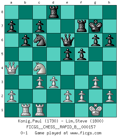 Last move : 0-1 2010 September 11 21:43:21 [Event "FICGS__CHESS__RAPID_B__000157"] [Site "FICGS"] [Date "2010.08.11"] [Round "1"] [White "Konig,Paul"] [Black "Lim,Steve"] [Result "0-1"] [WhiteElo "1730"] [BlackElo "1800"] 1.c4 e5 2.Nc3 Nf6 3.Nf3 Nc6 4.g3 d5 5.cxd5 Nxd5 6.Bg2 Nxc3 7.bxc3 Bc5 8.O-O O-O 9.d3 Re8 10.Rb1 Bb6 11.Qa4 h6 12.Nd2 Be6 13.Nc4 Bd5 14.Bh3 Be6 15.Bxe6 Rxe6 16.Qc2 Bc5 17.Be3 Bxe3 18.Nxe3 b6 19.Rfd1 Qd7 20.Qa4 Rd8 21.Re1 g6 22.Rec1 Kg7 23.Qa6 f5 24.Rd1 Re7 25.Nc4 Qe6 26.Qa4 Red7 27.Rdc1 Rf7 0-1 English Opening Kingside Castling by player White (move 8) Kingside Castling by player Black (move 8) Player Black won this chess game. Follow this game move after move (download)In Chess, as it is played by masters, chance is practically eliminated. (Emanuel Lasker) Aljechin war kein Nazi. Er war ein Opportunist. Ein schrecklicher Mann. Er liebte Geld über alles und würde für Geld ein Jude, ein Katolik oder ein Protestant werden. (Miguel Najdorf) Cuando veas una buena jugada, trata de encontrar otra mejor. (Emanuel Lasker) Le succès, c'est être capable d'aller d'échec en échec sans perdre son enthousiasme. (Winston Churchill) Art disturbs, science reassures. (Georges Braque, Le Jour et la Nuit)
