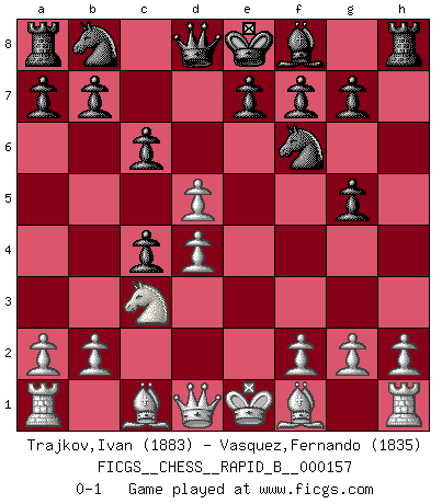 Last move : 0-1 2010 October 13 21:48:45 [Event "FICGS__CHESS__RAPID_B__000157"] [Site "FICGS"] [Date "2010.08.11"] [Round "1"] [White "Trajkov,Ivan"] [Black "Vasquez,Fernando"] [Result "0-1"] [WhiteElo "1883"] [BlackElo "1835"] 1.d4 d5 2.c4 dxc4 3.Nf3 Nf6 4.e3 Be6 5.Nc3 c6 6.Ng5 Bd5 7.e4 h6 8.exd5 hxg5 0-1 This chess game has been lost on time (started : 2010.08.11 0:31:50) QGA, Flohr variation Player Black won this chess game. Follow this game move after move (download)The essence of Chess is thinking about what Chess is. (David Bronstein) Dass jemand wie Surab Asmaiparaschwili, der selbst Elopunkte gekauft hat , Vize-Präsident der Fide werden konnte, sagt schon einges über den Zustand dieser Organisation aus. (Joel Lautier) Una buena memoria, concentración, imaginación y una fuerte voluntad, se requiere para llegar a ser un buen jugador. (Bobby Fischer) Roi des jeux et jeu des rois, les échecs portent en eux un sentiment d'infini. Ils donnent à celui qui s'est efforcé d'en approfondir les arcanes l'impression de n'être pas à la mesure de l'homme; en fait, ils constituent un résumé de l'univers, un microcosme, et figurent cette grande échelle qui, dans les plans de la lumière descend jusqu'à la matière, qui des abîmes insondables remonte jusqu'en l'infini de Dieu. (Pyrame) It's not a bug - it's an undocumented feature. (Anonymous)