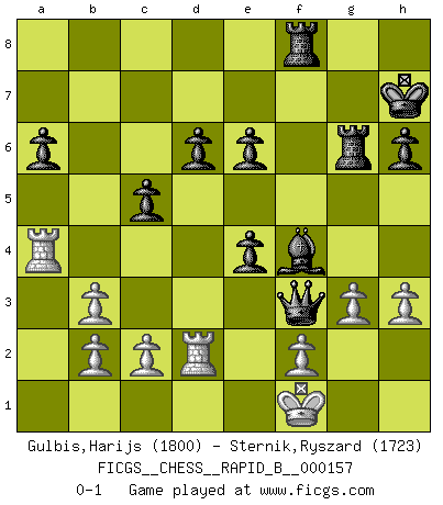 Last move : 0-1 2010 September 5 8:26:38 [Event "FICGS__CHESS__RAPID_B__000157"] [Site "FICGS"] [Date "2010.08.11"] [Round "1"] [White "Gulbis,Harijs"] [Black "Sternik,Ryszard"] [Result "0-1"] [WhiteElo "1800"] [BlackElo "1723"] 1.e4 c5 2.Nf3 Nc6 3.d4 cxd4 4.Nxd4 Nf6 5.Nc3 d6 6.Bb5 Bd7 7.O-O g6 8.Nxc6 bxc6 9.Bc4 Bg7 10.h3 O-O 11.Rb1 Qc8 12.Bb3 Be6 13.Re1 Rd8 14.Qf3 a6 15.Bg5 h6 16.Bf4 Bxb3 17.axb3 Nd7 18.Ra1 Qb7 19.Be3 c5 20.Qe2 Ne5 21.Qd2 Kh7 22.Red1 Nc6 23.Qe2 e6 24.Ra4 Nd4 25.Qd3 f5 26.exf5 gxf5 27.Ne2 Rg8 28.Bxd4 Bxd4 29.g3 Be5 30.Qc4 Qf3 31.Rd2 Rg6 32.Qe4 fxe4 33.Kf1 Rf8 34.Nf4 Bxf4 0-1 Sicilian defense Kingside Castling by player White (move 7) Kingside Castling by player Black (move 10) Player Black won this chess game. Follow this game move after move (download)It began to feel as though you were playing against Chess itself. - On playing against Robert Fischer. (Walter Shipman) Nach Morphy wurde nichts neues mehr in der Behandlung offener Positionen gefunden. (Mikhail Moiseyevich Botvinik) Aún el Rey más flojo huye despavorido ante la amenaza de un Jaque doble. (Aaron Nimzowitsch) Il s'avisa de me proposer d'apprendre les échecs qu'il jouait un peu... me voilà forcené des échecs. J'achète un échiquier, je m'enferme dans ma chambre, j'y passe des jours et des nuits à vouloir apprendre par cur toutes les parties. (Jean-Jacques Rousseau, Confessions) The obstacle is the path. (Zen proverb)