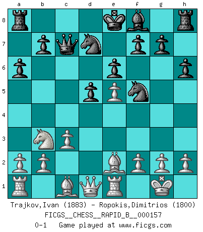 Last move : 0-1 2010 September 27 9:15:49 [Event "FICGS__CHESS__RAPID_B__000157"] [Site "FICGS"] [Date "2010.08.11"] [Round "1"] [White "Trajkov,Ivan"] [Black "Ropokis,Dimitrios"] [Result "0-1"] [WhiteElo "1883"] [BlackElo "1800"] 1.e4 c6 2.d4 d5 3.e5 Bf5 4.Nf3 e6 5.Be2 Ne7 6.O-O h6 7.c3 Nd7 8.Nbd2 Qc7 9.Re1 c5 10.dxc5 Qxc5 11.Nb3 Qc7 12.Nfd4 a6 13.Nxf5 Nxf5 0-1 This chess game has been lost on time (started : 2010.08.11 0:31:50) Caro-Kann : Advance variation Kingside Castling by player White (move 6) Player Black won this chess game. Follow this game move after move (download)Good offense and good defense both begin with good development. (Bruce A. Moon) Du weisst es gibt ein Problem mit Computern und Fernschach, wenn jeder eine Rating von 2450 hat. (John Christen Knudsen) ¿Porque tengo que perder ante este idiota?. (Aron Nimzovich) Assurément je connaissais par expérience le mystérieux attrait de ce jeu royal, le seul entre tous les jeux inventés par les hommes qui échappe souverainement à la tyrannie du hasard, le seul où l'on ne doive sa victoire qu'à son intelligence ou plutôt à une certaine forme d'intelligence. Mais n'est-ce pas déjà le limiter injurieusement que d'appeler les échecs un jeu ? N'est-ce pas une science, un art ou quelque chose qui, comme le cercueil de Mahomet entre ciel et terre, est suspendu entre l'un et l'autre, et qui réunit un nombre incroyable de contraires ? [...] C'est une pensée qui ne mène à rien, une mathématique qui n'établit rien, un art qui ne laisse pas d'uvre, une architecture sans matière; et il l'a prouvé néanmoins qu'il était plus durable, à sa manière, que les livres ou que tout autre monument, ce jeu unique qui appartient à tous les peuples et à tous les temps, et dont personne ne sait quel dieu en fit don à la terre pour tuer l'ennui, pour aiguiser l'esprit et stimuler l'âme. Où commence-t-il, où finit-il ? (Stefan Zweig) Information on the Internet is subject to the same rules and regulations as conversation at a bar. (George Lundberg)