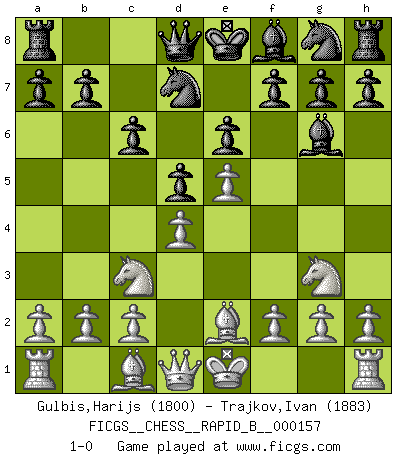Last move : 1-0 2010 September 18 21:1:42 [Event "FICGS__CHESS__RAPID_B__000157"] [Site "FICGS"] [Date "2010.08.11"] [Round "1"] [White "Gulbis,Harijs"] [Black "Trajkov,Ivan"] [Result "1-0"] [WhiteElo "1800"] [BlackElo "1883"] 1.e4 c6 2.d4 d5 3.e5 Bf5 4.Ne2 e6 5.Nbc3 Nd7 6.Ng3 Bg6 7.Be2 1-0 This chess game has been lost on time (started : 2010.08.11 0:31:50) Caro-Kann : Advance variation Player White won this chess game. Follow this game move after move (download)Chess problems demand from the composer the same virtues that characterize all worthwhile art: originality, invention, conciseness, harmony, complexity, and splendid insincerity. (Vladimir Nabokov) Der Partner hat auch seine Existenzberechtigung. (Savielly Grigorievitsch Tartakower) El Peón aislado arroja penumbra sobre todo el tablero. (Aaron Nimzovich) Même un GMI sait rarement calculer sur plus de cinq coups une attaque à sacrifices. (Rudolf Spielmann) Luck is what you have left over after you give 100 percent. (Langston Coleman)