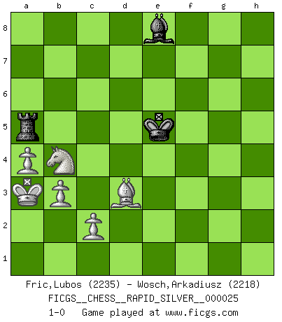 Last move : 1-0 2011 March 12 9:21:20 [Event "FICGS__CHESS__RAPID_SILVER__000025"] [Site "FICGS"] [Date "2010.08.11"] [Round "2"] [White "Fric,Lubos"] [Black "Wosch,Arkadiusz"] [Result "1-0"] [WhiteElo "2235"] [BlackElo "2218"] 1.e4 c5 2.Nf3 Nc6 3.d4 cxd4 4.Nxd4 Nf6 5.Nc3 d6 6.Bg5 e6 7.Qd2 a6 8.O-O-O Bd7 9.f4 b5 10.Bxf6 gxf6 11.Kb1 Qb6 12.Nxc6 Bxc6 13.f5 Qc5 14.Bd3 h5 15.Qe1 Be7 16.Qg3 Kd7 17.Qh3 Rag8 18.Rhe1 b4 19.fxe6+ fxe6 20.Ne2 f5 21.Nf4 Bg5 22.g3 h4 23.exf5 hxg3 24.Qxg3 Bh4 25.Nxe6 Qb6 26.Qe3 Qxe3 27.Rxe3 Bf2 28.Re2 Bf3 29.Rxf2 Bxd1 30.b3 Rg1 31.Kb2 a5 32.Nd4 d5 33.f6 Kd6 34.Rf5 R1g8 35.Nb5+ Kc6 36.f7 Rf8 37.Rf6+ Kd7 38.Bf5+ Kd8 39.Ra6 Ke7 40.Re6+ Kd8 41.Bg6 Bg4 42.Re5 Kd7 43.Rxd5+ Ke6 44.Rd6+ Ke7 45.Ra6 Ra8 46.Na7 Bd7 47.Rxa5 Rxh2 48.Rc5 R2h8 49.Nb5 Rac8 50.Rc7 Rhf8 51.Ra7 Ra8 52.Rxa8 Rxa8 53.Nc7 Ra5 54.Bd3 Kxf7 55.Na6 Kf6 56.Nxb4 Ke5 57.a4 Be8 58.Ka3 1-0 Sicilian defense Queenside Castling by player White (move 8) 10 pieces endgame at move 54 : White KBNPPP , Black KRBP WHITE : King + 1 Bishop 1 Knight 3 Pawns BLACK : King + 1 Rook 1 Bishop 1 Pawn 9 pieces endgame at move 56 : White KBNPPP , Black KRB WHITE : King + 1 Bishop 1 Knight 3 Pawns BLACK : King + 1 Rook 1 Bishop Player White won this chess game. Follow this game move after move (download)Spassky will not be psyched out by Fischer. (Mike Goodall) Wenn ich Weiß habe gewinne ich weil ich Weiß habe, wenn ich Schwarz habe gewinne ich weil ich Bogoljubov bin. (Efim Bogoljubov) En el tablero, la mentira e hipocresía no sobreviven mucho. (Emanuel Lasker) A chaque perte on perd un peu de soi. (Joël Lautier) Computer Science is no more about computers than astronomy is about telescopes. (Edsger W. Dijkstra)