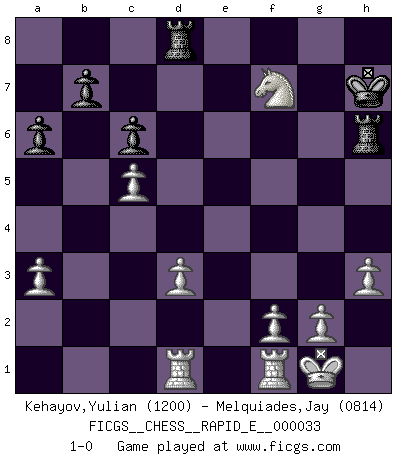 Last move : 1-0 2010 August 23 21:24:40 [Event "FICGS__CHESS__RAPID_E__000033"] [Site "FICGS"] [Date "2010.08.11"] [Round "1"] [White "Kehayov,Yulian"] [Black "Melquiades,Jay"] [Result "1-0"] [WhiteElo "1200"] [BlackElo "0814"] 1.e4 e5 2.d3 Nc6 3.Be3 d5 4.Nf3 d4 5.Bd2 Bg4 6.h3 Bh5 7.Be2 Bb4 8.c3 dxc3 9.Nxc3 Nf6 10.a3 Bc5 11.O-O a6 12.Qc1 Nd4 13.Qd1 Bxf3 14.Bxf3 h6 15.Nd5 Nd7 16.Be3 Nxf3+ 17.Qxf3 O-O 18.Bxc5 Nxc5 19.b4 f6 20.bxc5 c6 21.Nb6 Rb8 22.Rad1 g6 23.Qe3 f5 24.exf5 Rxf5 25.Qxh6 Rf6 26.Nc4 g5 27.Qxg5+ Kh7 28.Nxe5 Rh6 29.Qxd8 Rxd8 30.Nf7 1-0 Variation Indian Opening : Indian Opening Kingside Castling by player White (move 11) Kingside Castling by player Black (move 17) Player White won this chess game. Follow this game move after move (download)I like to say that Bobby Fischer was the greatest player ever. But what made Fischer a genius was his ability to blend an American freshness and pragmatism with Russian ideas about strategy. (Bruce Pandolfini) Kann Schach nicht schließlich das Nationalspiel der Deutschen werden? Und welche weiteren Ausblicke bieten sich dann dar! Welche Hebung des allgemeinen Kultur-Niveaus, ja der Moral, wenn das Schachbrett den Kartentisch verdrängen würde! Wahrlich, ein Ziel, des Schweißes der Edlen wert! (Siegbert Tarrasch) El Ajedrez era la lengua materna de Capablanca. (Reti) Il s'avisa de me proposer d'apprendre les échecs qu'il jouait un peu... me voilà forcené des échecs. J'achète un échiquier, je m'enferme dans ma chambre, j'y passe des jours et des nuits à vouloir apprendre par cœur toutes les parties. (Jean-Jacques Rousseau, Confessions) Empty your mind, be formless, shapeless — like water. (Bruce Lee)
