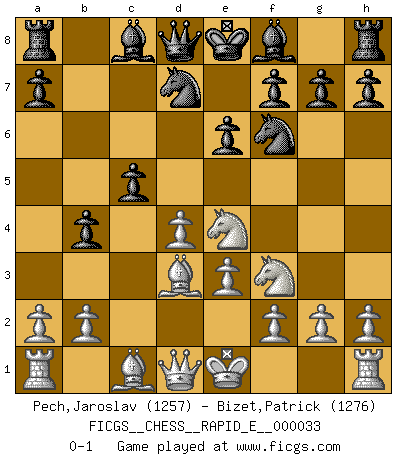 Last move : 0-1 2010 September 26 21:8:51 [Event "FICGS__CHESS__RAPID_E__000033"] [Site "FICGS"] [Date "2010.08.11"] [Round "1"] [White "Pech,Jaroslav"] [Black "Bizet,Patrick"] [Result "0-1"] [WhiteElo "1257"] [BlackElo "1276"] 1.d4 d5 2.c4 c6 3.Nf3 Nf6 4.e3 e6 5.Nc3 Nbd7 6.Bd3 dxc4 7.Bxc4 b5 8.Bd3 b4 9.Ne4 c5 0-1 QGD Slav : 4.e3 Player Black won this chess game. Follow this game move after move (download)My God, Bobby Fischer plays so simply. (Alexei Suetin) Ich glaube, ich kenne inzwischen die Gründe für mein Versagen: schachliche Charakterfehler. Ich war nie ein Wunderkind und in meiner gesamten menschlichen Entwicklung immer zu langsam. (Viktor Kortschnoi) En el tablero, la mentira e hipocresía no sobreviven mucho. (Emanuel Lasker) Donnez-moi un Cavalier en 6e et je gagnerais toutes mes parties. (Steinitz) History is a gallery of pictures in which there are few originals and many copies. (Alexis de Tocqueville)