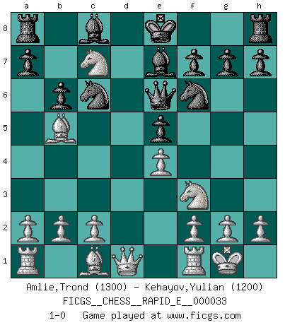 Last move : 1-0 2010 August 17 21:21:47 [Event "FICGS__CHESS__RAPID_E__000033"] [Site "FICGS"] [Date "2010.08.11"] [Round "1"] [White "Amlie,Trond"] [Black "Kehayov,Yulian"] [Result "1-0"] [WhiteElo "1300"] [BlackElo "1200"] 1.e4 c5 2.Nf3 d6 3.d4 e6 4.dxc5 b6 5.cxd6 Qxd6 6.Bd3 Nc6 7.O-O e5 8.Nc3 Nf6 9.Bb5 Qe6 10.Nd5 Be7 11.Nc7+ 1-0 Sicilian Kingside Castling by player White (move 7) Player White won this chess game. Follow this game move after move (download)When in doubt... play Chess ! (Tevis) Schach wird sich dank seiner hohen kulturellen Tradition immer durchsetzen. In näherer Zukunft womöglich sogar als Gegenreaktion auf die maßlose Reizüberflutung im Freizeit- und Spielbereich. (Garry Kasparov) a manera como él juega al Ajedrez, demuestra la completa naturaleza de un hombre. (Stanley Ellin) On croit qu'il y a plus de mauvais joueurs que de bons joueurs, c'est faux : Il y a autant de joueurs qui gagnent que de joueurs qui perdent. (Philippe Geluck) All men can see these tactics whereby I conquer, but what none can see is the strategy out of which victory is evolved. (Sun Tzu)