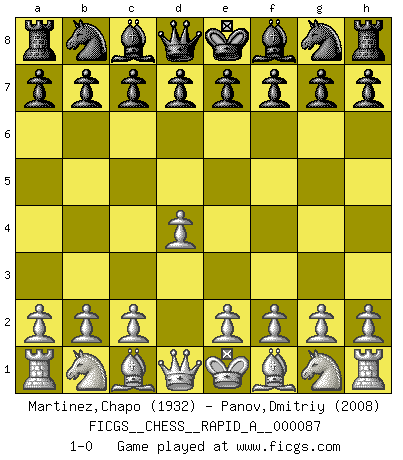 Last move : 1-0 2010 September 10 23:28:21 [Event "FICGS__CHESS__RAPID_A__000087"] [Site "FICGS"] [Date "2010.08.11"] [Round "1"] [White "Martinez,Chapo"] [Black "Panov,Dmitriy"] [Result "1-0"] [WhiteElo "1932"] [BlackElo "2008"] 1.d4 1-0 This chess game has been lost on time (started : 2010.08.11 17:3:55) Queen's pawn Player White won this chess game. Follow this game move after move (download)You can only get good at Chess if you love the game. (Bobby Fischer) Im Schach gewinnt jeder. Hat man Freunde am Spiel - und das ist die Hauptsache - ist auch der Verlust einer Partie kein Unglück. (David Bronstein) El Ajedrez demanda una total concentración. (Bobby Fischer) Aux échecs, l'amour-propre est satisfait quand on remporte la victoire, mais il n'y a pas de honte à être battu. (Benjamin Franklin) A woman without a man is like a fish without a bicycle. (Gloria Steinem)