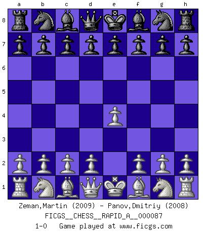Last move : 1-0 2010 September 10 23:28:21 [Event "FICGS__CHESS__RAPID_A__000087"] [Site "FICGS"] [Date "2010.08.11"] [Round "1"] [White "Zeman,Martin"] [Black "Panov,Dmitriy"] [Result "1-0"] [WhiteElo "2009"] [BlackElo "2008"] 1.e4 1-0 This chess game has been lost on time (started : 2010.08.11 17:3:55) King's pawn Opening Player White won this chess game. Follow this game move after move (download)Robert Fischer is a law unto himself. (Larry Evans) Glücklicherweise sind Großmeister Ruben Fines reine Schachbücher weniger phallozentrisch [als seine Schachpsychologie] und deswegen auch weniger lächerlich. (Nigel Short) Los Peones son nacidos libres, y aún así, se encuentran encadenados por todos lados. (Rick Kennedy) Shah mat. Le roi est mort. Cri de fierté d'un joueur venant de terrasser son adversaire, courtoisement, sans effusion de sang. Looking at the proliferation of personal web pages on the Net, it looks like very soon everyone on Earth will have 15 megabytes of fame. (M.G. Sriram)