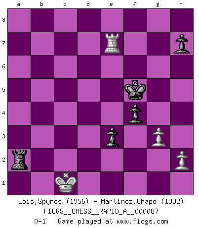 Last move : 0-1 2010 October 13 16:18:13 [Event "FICGS__CHESS__RAPID_A__000087"] [Site "FICGS"] [Date "2010.08.11"] [Round "1"] [White "Lois,Spyros"] [Black "Martinez,Chapo"] [Result "0-1"] [WhiteElo "1956"] [BlackElo "1932"] 1.e4 c5 2.Nf3 Nc6 3.d4 cxd4 4.Nxd4 g6 5.Be3 Bg7 6.Nc3 Nf6 7.Bc4 O-O 8.Bb3 d6 9.f3 Bd7 10.Qd2 Na5 11.O-O-O Rb8 12.Bh6 Bxh6 13.Qxh6 b5 14.Nd5 e5 15.Ne2 Nxb3+ 16.cxb3 Nxd5 17.Rxd5 Be6 18.Rd2 Qe7 19.Kb1 Rfc8 20.f4 f5 21.Rhd1 fxe4 22.fxe5 dxe5 23.Nc3 Rd8 24.Ka1 Bg4 25.Rf1 Rxd2 26.Qxd2 Rd8 27.Qe3 Bf5 28.Nxe4 Qh4 29.Ng3 Qd4 30.Qxd4 Rxd4 31.Nxf5 gxf5 32.Kb1 f4 33.Re1 e4 34.Kc2 b4 35.Re2 Kf7 36.a3 a5 37.Kc1 Ke6 38.Rc2 e3 39.Rc8 bxa3 40.bxa3 Rd3 41.Ra8 Kd7 42.Ra7+ Kc6 43.Ra6+ Kb5 44.Re6 Kc5 45.b4+ axb4 46.axb4+ Kxb4 47.Re8 Kc3 48.Rc8+ Kd4 49.Rd8+ Ke4 50.Re8+ Kf5 51.Re7 Rd2 52.g3 Ra2 0-1 Sicilian defense Kingside Castling by player Black (move 7) Queenside Castling by player White (move 11) 10 pieces endgame at move 46 : White KRPPP , Black KRPPP WHITE : King + 1 Rook 3 Pawns BLACK : King + 1 Rook 3 Pawns 9 pieces endgame at move 46 : White KRPP , Black KRPPP WHITE : King + 1 Rook 2 Pawns BLACK : King + 1 Rook 3 Pawns Player Black won this chess game. Follow this game move after move (download)Suddenly it was obvious to me in my analysis I had missed what Fischer had found with the greatest of ease at the board. (Mikhail Botvinnik) Ein Isolani verdüstert die Stimmung auf dem ganzen Schachbrett. (Savielly Grigorievitsch Tartakower) Preferería tener un Peón que un dedo. (Reuben Fine) Tout change constamment, y compris dans le monde des Echecs. (Botvinnik) If everyone is thinking alike, then somebody isn't thinking. (US General George S. Patton)
