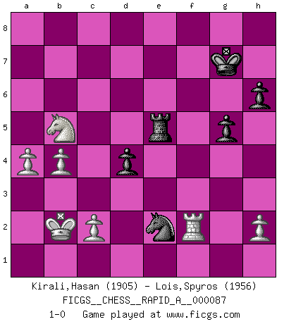 Last move : 1-0 2010 October 24 19:19:9 [Event "FICGS__CHESS__RAPID_A__000087"] [Site "FICGS"] [Date "2010.08.11"] [Round "1"] [White "Kirali,Hasan"] [Black "Lois,Spyros"] [Result "1-0"] [WhiteElo "1905"] [BlackElo "1956"] 1.e4 e5 2.d4 exd4 3.Qxd4 Nc6 4.Qa4 Bc5 5.Nf3 d6 6.Bg5 f6 7.Bd2 Nge7 8.Bc4 Bg4 9.Qb3 Bxf3 10.Qxf3 Ne5 11.Qh5+ g6 12.Qe2 N7c6 13.Bb5 Qd7 14.f4 a6 15.Ba4 b5 16.fxe5 bxa4 17.exf6 Nd4 18.Qd3 O-O 19.Nc3 Rxf6 20.O-O-O Qg4 21.Be3 Ne6 22.Bxc5 dxc5 23.Kb1 Qxg2 24.Qc4 Re8 25.Qxa4 Rb8 26.Nd5 Rf2 27.Qc4 Rf7 28.e5 Kg7 29.b3 Rd8 30.Nf6 Qf3 31.Rdf1 Qh3 32.Rhg1 Re7 33.Rg4 Rd4 34.Rxd4 cxd4 35.Qxa6 Ng5 36.Nd5 Qe6 37.Qxe6 Rxe6 38.Nxc7 Rxe5 39.a4 Ne4 40.Kb2 Nc3 41.Rf4 Ne2 42.Rf2 h6 43.Nb5 g5 44.b4 1-0 Centre game Kingside Castling by player Black (move 18) Queenside Castling by player White (move 20) Player White won this chess game. Follow this game move after move (download)Chess is a terrible game. If you have no center, your opponent has a freer position. If you do have a center, then you really have something to worry about ! (Siegbert Tarrasch) Kein Großmeister ist normal. Sie unterscheiden sich nur im Ausmaß Ihrer Verrücktheit. (Viktor Kortschnoi) Me dio la sensación de como si yo estuviera jugando en contra del mismo Ajedrez. - al estar jugando en contra de Robert Fischer (Walter Shipman) Aux échecs, les retours au sommet sont rares : les dommages psychologiques consécutifs à une défaite sont trop sévères. (Daily Telegraph) Optimism is a variety of information deficit. Sometimes especially true for correspondence chess games. (Michael Aigner)