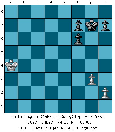 Last move : 0-1 2010 September 17 8:27:50 [Event "FICGS__CHESS__RAPID_A__000087"] [Site "FICGS"] [Date "2010.08.11"] [Round "1"] [White "Lois,Spyros"] [Black "Cade,Stephen"] [Result "0-1"] [WhiteElo "1956"] [BlackElo "1996"] 1.e4 c5 2.Nf3 d6 3.d4 cxd4 4.Nxd4 Nf6 5.Nc3 a6 6.Bg5 e6 7.f4 Qc7 8.Qf3 b5 9.Bxf6 gxf6 10.a3 Nc6 11.O-O-O Nxd4 12.Rxd4 Bb7 13.f5 Qc5 14.Rd1 Rc8 15.Kb1 Be7 16.Be2 Qe5 17.Rhe1 Bd8 18.Qe3 Ba5 19.Qa7 Bxc3 20.Qxb7 O-O 21.bxc3 Qxc3 22.Qb6 b4 23.Qd4 Qxc2+ 24.Ka1 Rc3 25.Qxb4 Rb3 26.Rd2 Rxa3+ 27.Qxa3 Qxd2 28.Rc1 Qxe2 29.Qg3+ Kh8 30.Qxd6 Re8 31.fxe6 Qe3 32.Qc5 Qxc5 33.Rxc5 Rxe6 34.Rc4 Rd6 35.Rc2 Rd1+ 36.Kb2 Re1 37.Kb3 Rxe4 38.g3 a5 39.Ra2 a4+ 40.Rxa4 Rxa4 41.Kxa4 Kg7 0-1 Sicilian : Najdorf, 7.f4 Queenside Castling by player White (move 11) Kingside Castling by player Black (move 20) 10 pieces endgame at move 37 : White KRPP , Black KRPPPP WHITE : King + 1 Rook 2 Pawns BLACK : King + 1 Rook 4 Pawns 9 pieces endgame at move 40 : White KRPP , Black KRPPP WHITE : King + 1 Rook 2 Pawns BLACK : King + 1 Rook 3 Pawns 8 pieces endgame at move 40 : White KPP , Black KRPPP WHITE : King + 2 Pawns BLACK : King + 1 Rook 3 Pawns 7 pieces endgame at move 41 : White KPP , Black KPPP WHITE : King + 2 Pawns BLACK : King + 3 Pawns Player Black won this chess game. Follow this game move after move (download)Nonsense was the last thing Fischer was interested in, as far as Chess was concerned. (Elie Agur) Du musst nicht gut spielen, es reicht, wenn du besser spielst als dein Gegner. (Anonymous) El Ajedrez por encima de todo... ¡es una pelea!. (Emanuel Lasker) Les Echecs sont affaire de jugement sensible. Savoir quand frapper et quand esquiver. (Fischer) . 'gn is not allowed in chess unless n is an integer between 1 and 8 inclusive, where 1 and 8 are to interpreted as the standard numerals standing for integers in the ordered real-closed field R, with the *canonical* ordering. (As opposed to, say, an integer in the domain Z[2+i*sqrt(5)] or an integer in some exotic Grothendieck topos). (Normajean Yates)