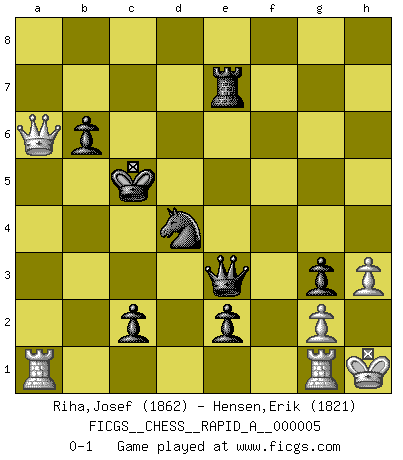 Last move : 0-1 2006 November 23 11:55:20 [Event "FICGS__CHESS__RAPID_A__000005"] [Site "FICGS"] [Date "2006.11.16"] [Round "1"] [White "Riha,Josef"] [Black "Hensen,Erik"] [Result "0-1"] [WhiteElo "1862"] [BlackElo "1821"] 1.d4 Nf6 2.c4 e6 3.Nf3 d5 4.Bg5 Be7 5.Nc3 h6 6.Bh4 O-O 7.e3 b6 8.Bd3 Bb7 9.O-O Nbd7 10.Qe2 c5 11.Rfd1 Ne4 12.Bxe7 Qxe7 13.cxd5 exd5 14.Rac1 Rfd8 15.Ba6 Bxa6 16.Qxa6 Nxc3 17.Rxc3 Nf6 18.Rc2 Rac8 19.b4 c4 20.b5 Rc7 21.Ne5 Re8 22.Rdc1 Qe6 23.Qa3 Ne4 24.Qb4 g5 25.f3 Nd6 26.e4 f5 27.exd5 Qxd5 28.Nc6 a6 29.a4 f4 30.Qb1 Kg7 31.Rb2 Re6 32.Qc2 axb5 33.axb5 h5 34.h3 Re3 35.Kh2 Kf6 36.Rd1 g4 37.fxg4 hxg4 38.Ne5 g3+ 39.Kh1 Nf5 40.R2b1 c3 41.Rf1 Nxd4 42.Ng4+ Kg7 43.Nxe3 fxe3 44.Qd3 Qe5 45.Rbc1 e2 46.Rfe1 Qf4 47.Rg1 c2 48.Qa3 Kf6 49.Qf8+ Ke5 50.Qe8+ Kd5 51.Qg6 Re7 52.Qg8+ Kc5 53.Qc8+ Kxb5 54.Ra1 Qe3 55.Qa6+ Kc5 0-1 Queen's pawn game Kingside Castling by player Black (move 6) Kingside Castling by player White (move 9) Player Black won this chess game. Follow this game move after move (download)If your opponent offers you a draw, try to work out why he thinks he's worse off. (Nigel Short) Nach Morphy wurde nichts neues mehr in der Behandlung offener Positionen gefunden. (Mikhail Moiseyevich Botvinik) Las combinaciones han sido siempre el aspecto más intrigante del Ajedrez. Los Maestros las buscan, el público las aplauden, los críticos las alaban. La razón se debe a que las combinaciones hacen posible que el Ajedrez sea más que un ejercicio matemático con una carencia de vida. Ellas son la poesía del juego, son del Ajedrez lo que la melodía es de la música. Ellas representan el triunfo de la mente sobre la materia. (Reuben Fine) A chaque perte on perd un peu de soi. (Joël Lautier) They misunderestimated me. (George W. Bush, Bentonville nov. 6, 2000)