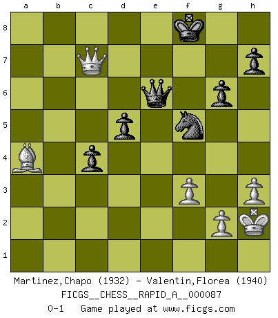 Last move : 0-1 2010 October 27 19:19:1 [Event "FICGS__CHESS__RAPID_A__000087"] [Site "FICGS"] [Date "2010.08.11"] [Round "1"] [White "Martinez,Chapo"] [Black "Valentin,Florea"] [Result "0-1"] [WhiteElo "1932"] [BlackElo "1940"] 1.d4 Nf6 2.c4 e6 3.Nf3 b6 4.a3 Bb7 5.Nc3 d5 6.cxd5 Nxd5 7.Bd2 Nd7 8.Nxd5 exd5 9.Bf4 c5 10.e3 c4 11.Be2 Be7 12.O-O O-O 13.Qc2 b5 14.h3 Qb6 15.Rfb1 Bd6 16.Bxd6 Qxd6 17.b3 a6 18.a4 Bc6 19.Nd2 Nf6 20.Nf3 Ne4 21.Ne5 f6 22.Nxc6 Qxc6 23.bxc4 bxc4 24.a5 Rfb8 25.Rb6 Rxb6 26.axb6 a5 27.Bd3 f5 28.f3 Nf6 29.Bxf5 Qxb6 30.Rb1 Qc6 31.Qc3 Qd6 32.e4 g6 33.e5 Qc6 34.Bc2 Nh5 35.Qa3 Qc7 36.Qe3 a4 37.Ra1 Ng7 38.Rxa4 Rxa4 39.Bxa4 Nf5 40.Qg5 Nxd4 41.Qf6 Qf7 42.Qb6 Qf4 43.Qc7 Kf8 44.Kf2 Qd2+ 45.Kf1 Qc1+ 46.Kf2 Nf5 47.e6 Qd2+ 48.Kg1 Qe1+ 49.Kh2 Qxe6 0-1 Queen's Indian : Petrosian system Kingside Castling by player White (move 12) Kingside Castling by player Black (move 12) Player Black won this chess game. Follow this game move after move (download)One bad move nullifies forty good ones. (Horowitz) Sitze auf Deine Hände. (Siegbert Tarrasch) Los Peones son nacidos libres, y aún así, se encuentran por doquier encadenados. (Rick Kennedy) Les échecs, c'est la lutte contre l'erreur. (Johannes Zukertort) At last I discovered the true beauty of chess. So I proposed to her. (Dinesh De Silva)