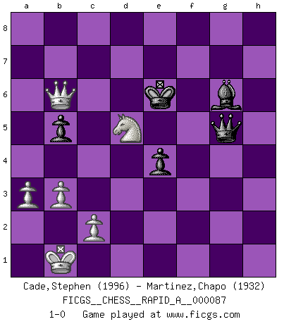 Last move : 1-0 2010 October 26 21:24:4 [Event "FICGS__CHESS__RAPID_A__000087"] [Site "FICGS"] [Date "2010.08.11"] [Round "1"] [White "Cade,Stephen"] [Black "Martinez,Chapo"] [Result "1-0"] [WhiteElo "1996"] [BlackElo "1932"] 1.e4 c5 2.Nc3 Nc6 3.Nge2 g6 4.d4 cxd4 5.Nxd4 Bg7 6.Be3 Nf6 7.Bc4 O-O 8.Bb3 d6 9.f3 Bd7 10.Qd2 Na5 11.O-O-O Rb8 12.Bh6 Bxh6 13.Qxh6 b5 14.Nd5 Nxb3+ 15.Nxb3 Nxd5 16.exd5 Qc7 17.h4 Rbc8 18.Rd2 f6 19.Kb1 Rf7 20.Qe3 a5 21.h5 g5 22.f4 a4 23.Nd4 gxf4 24.Qxf4 Qc4 25.Qf3 a3 26.Qxa3 Qxd5 27.h6 Qg5 28.Qd3 Rc4 29.a3 Qg4 30.Qe3 Qg5 31.Qf2 Kh8 32.Rd3 Rc8 33.Rg3 Qd5 34.Re1 Rcf8 35.Nb3 Qb7 36.Qd2 Rg8 37.Rxg8+ Kxg8 38.Nc1 Qc7 39.Nd3 Kf8 40.Nf4 Qc4 41.Nd5 Qc5 42.Re3 e6 43.Nb4 d5 44.Re1 Qc4 45.Qf2 d4 46.g4 e5 47.Qg2 d3 48.Nxd3 Qxg4 49.Qa8+ Be8 50.Nc5 Re7 51.Rf1 Qg6 52.Qf3 f5 53.Qxf5+ Rf7 54.Qh3 Rxf1+ 55.Qxf1+ Kg8 56.Qc1 Kf7 57.b3 Qd6 58.Ne4 Qg6 59.Qe3 Bc6 60.Qa7+ Ke6 61.Nc5+ Kf5 62.Nd3 Qxh6 63.Qe7 Qf6 64.Qxh7+ Kg5 65.Qc7 e4 66.Nb4 Be8 67.Nd5 Qf5 68.Qe7+ Kh6 69.Qd6+ Kg7 70.Ne3 Qf6 71.Qc7+ Kg8 72.Nd5 Qg5 73.Qc5 Kf7 74.Qa7+ Kg6 75.Qd4 Kf5 76.Qh8 Bg6 77.Qc8+ Ke5 78.Qb8+ Ke6 79.Qb6+ 1-0 Sicilian : chameleon variation Kingside Castling by player Black (move 7) Queenside Castling by player White (move 11) Player White won this chess game. Follow this game move after move (download)It is always better to sacrifice your opponent's men. (Savielly Tartakower) Wenn Spassky eine Figur opfert kannst du genauso gut aufgeben. Aber wenn Tal eine Figur opfert, spiel weiter. Er könnte noch eine weitere opfern, und dann ... wer weiß? (Miguel Najdorf) Todavía soy una víctima del Ajedrez. Tiene toda la belleza del arte y mucho mas. No puede ser comercializado. El Ajedrez es mas puro que el arte en su posición social. (Marcel Duchamp) Même un GMI sait rarement calculer sur plus de cinq coups une attaque à sacrifices. (Rudolf Spielmann) You lose, general Kenobi. (General Grievous in Star Wars ep.3)