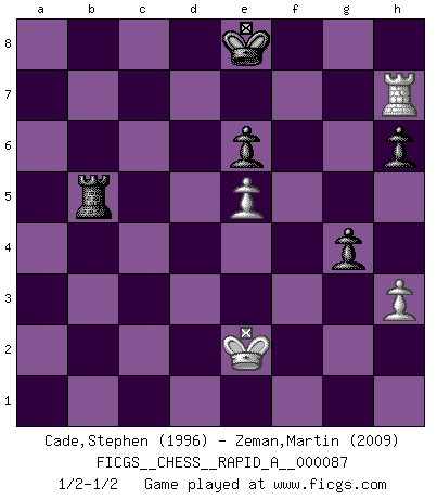 Last move : 1/2-1/2 2010 November 15 19:41:9 [Event "FICGS__CHESS__RAPID_A__000087"] [Site "FICGS"] [Date "2010.08.11"] [Round "1"] [White "Cade,Stephen"] [Black "Zeman,Martin"] [Result "1/2-1/2"] [WhiteElo "1996"] [BlackElo "2009"] 1.e4 c5 2.c3 d5 3.exd5 Qxd5 4.d4 Nf6 5.Nf3 Bg4 6.dxc5 Qxc5 7.Na3 a6 8.h3 Bf5 9.Bd3 Bxd3 10.Qxd3 e6 11.Nc4 Nbd7 12.Bf4 Rd8 13.Rd1 Nd5 14.Bg3 Be7 15.O-O O-O 16.Nd4 N7f6 17.Ne5 Nh5 18.Bh2 Bd6 19.Rfe1 Ndf4 20.Qc4 Qa5 21.Bxf4 Nxf4 22.Ndf3 Nd5 23.Qb3 Qc7 24.c4 Nb4 25.a3 Nc6 26.Nxc6 Qxc6 27.Qc2 b6 28.b4 h6 29.Nd4 Qc7 30.Qa4 Rc8 31.Qxa6 Ra8 32.Qb5 Rxa3 33.Qc6 Rc3 34.Qxc7 Bxc7 35.Nc6 Rxc4 36.b5 Rc5 37.Rd7 Bf4 38.g3 Bg5 39.Rb1 Ra8 40.Rb7 Ra2 41.Rxb6 R5c2 42.Nb4 Rcb2 43.Rxb2 Rxb2 44.Nd3 Rb1+ 45.Kg2 Bf6 46.Kf3 Rb3 47.Ke3 Kf8 48.f4 Ba1 49.g4 f5 50.Rb7 Ke8 51.b6 Bf6 52.Ke2 Bd4 53.Ne5 Rxb6 54.Rxg7 Bxe5 55.fxe5 Rb5 56.Rh7 fxg4 1/2-1/2 Sicilian : Alapin's variation (2.c3) Kingside Castling by player White (move 15) Kingside Castling by player Black (move 15) 10 pieces endgame at move 55 : White KRPPP , Black KRPPP WHITE : King + 1 Rook 3 Pawns BLACK : King + 1 Rook 3 Pawns 9 pieces endgame at move 56 : White KRPP , Black KRPPP WHITE : King + 1 Rook 2 Pawns BLACK : King + 1 Rook 3 Pawns This chess game ended in a draw. Follow this game move after move (download)A win by an unsound combination, however showy, fills me with artistic horror. (Wilhelm Steinitz) Es macht mich traurig, wenn ich sehe, dass Golfprofis mehr verdienen als Schachsportler. Obwohl ich davon überzeugt bin, dass wir Schachspieler viel härter trainieren müssen als die Golfer. (Alexandra Kosteniuk) Ser exitoso en el Ajedrez te permite descubrir tu propia personalidad. Eso es lo que deseo para los niños de mi clase. (Saudin Robovic) On a dit que l'homme se distingue de l'animal par le fait qu'il achète plus de livres qu'il ne peut en lire. Je voudrais suggérer qu'inclure à la liste des livres quelques livres d'échecs rendrait la distinction manifeste. (Edward Lasker) Begin at the beginning and go on till you come to the end; then stop. (Lewis Carrol, Alice in Wonderland)