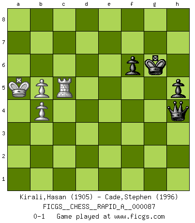 Last move : 0-1 2010 November 6 20:12:34 [Event "FICGS__CHESS__RAPID_A__000087"] [Site "FICGS"] [Date "2010.08.11"] [Round "1"] [White "Kirali,Hasan"] [Black "Cade,Stephen"] [Result "0-1"] [WhiteElo "1905"] [BlackElo "1996"] 1.e4 c5 2.Nf3 d6 3.d4 cxd4 4.Nxd4 Nf6 5.Nc3 a6 6.Be3 e5 7.Nb3 Be6 8.Qd2 Nbd7 9.f3 Be7 10.g4 O-O 11.O-O-O b5 12.g5 b4 13.Ne2 Ne8 14.f4 a5 15.f5 Bxb3 16.cxb3 a4 17.bxa4 Rxa4 18.b3 Ra5 19.Kb1 d5 20.exd5 Bc5 21.Bxc5 Nxc5 22.Qxb4 Nd6 23.Nc3 Qa8 24.Bb5 Rc8 25.Bc6 Qa7 26.a4 Rb8 27.Bb5 Nxb5 28.Nxb5 Raxb5 29.axb5 Ra8 30.Kc1 Nd3+ 31.Rxd3 Qa1+ 32.Kd2 Qxh1 33.Qc3 h5 34.Ke3 Qg1+ 35.Ke4 Qg4+ 36.Kxe5 f6+ 37.gxf6 gxf6+ 38.Kd6 Qf4+ 39.Kc6 Rc8+ 40.Kb6 Qb8+ 41.Ka6 Rxc3 42.Rxc3 Qa8+ 43.Kb6 Qxd5 44.Ka6 Qa8+ 45.Kb6 Qh1 46.h3 Kg7 47.b4 Qf1 48.h4 Qxf5 49.Rc5 Qb1 50.Kc6 Qe4+ 51.Kb6 Qxh4 52.Ka5 Kg6 0-1 Sicilian : Najdorf, Byrne (English) attack Kingside Castling by player Black (move 10) Queenside Castling by player White (move 11) 10 pieces endgame at move 43 : White KRPPPP , Black KQPP WHITE : King + 1 Rook 4 Pawns BLACK : King + 1 Queen 2 Pawns 9 pieces endgame at move 48 : White KRPPP , Black KQPP WHITE : King + 1 Rook 3 Pawns BLACK : King + 1 Queen 2 Pawns 8 pieces endgame at move 51 : White KRPP , Black KQPP WHITE : King + 1 Rook 2 Pawns BLACK : King + 1 Queen 2 Pawns Player Black won this chess game. Follow this game move after move (download)You sit at the board and suddenly your heart leaps. Your hand trembles to pick up the piece and move it. But what Chess teaches you is that you must sit there calmly and think about whether it's really a good idea and whether there are other better ideas. (Stanley Kubrick) Schach ist Krieg, im Schach geht es um testosterongesteuerte Urschreie. (Garry Kasparov) El jugador táctico debe saber que hacer cuando algo se debe de hacer. El estratégico debe saber que hacer cuando nada se debe de hacer. (Savielly Tartakover) Je ne suis pas le dernier à jouer lâchement des coups douteux pendant le zeïtnot de l'adversaire pour l'achever: en effet les coups qui font le plus peur sont ceux que l'on ne comprend pas. Je me fais souvent peur quand je joue. (Un professeur anonyme) Live, lose, and learn, by observing your opponent how to win. (Amber Steenbock)