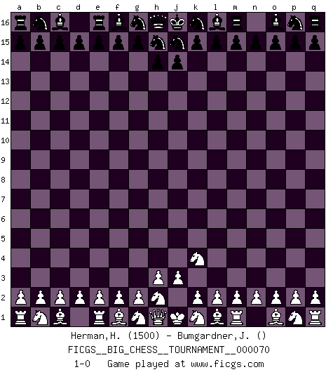 Last move : 1-0 2010 September 14 10:29:7 [Event "FICGS__BIG_CHESS__TOURNAMENT__000070"] [Site "FICGS"] [Date "2010.08.12"] [Round "1"] [White "Herman,Herdiansyah"] [Black "Bumgardner,James"] [Result "1-0"] [WhiteElo "1500"] [BlackElo ""] 1.j2-k4 1-0 Follow this game move after move (download)Chess mastery essentially consists of analyzing Chess positions accurately. (Mikhail Botvinnik) Ich habe die besten Aussichten, den ersten Preis zu gewinnen - denn jeder muss gegen Steinitz spielen, nur ich nicht! (Wilhelm Steinitz) En la perfecta combinación de Ajedrez como en una historia corta de primera clase, toda la trama y contra trama deberá conducir hacia un final sorprendente, el interes no es mitigado hasta el último momento. (Yates and Winter) L'attaque fait le spectacle, la défense gagne les matchs. (Dicton footballistique) Hold em is to stud what chess is to checkers. (Johnny Moss)