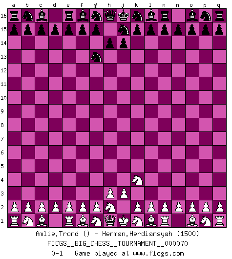 Last move : 0-1 2010 September 2 13:48:47 [Event "FICGS__BIG_CHESS__TOURNAMENT__000070"] [Site "FICGS"] [Date "2010.08.12"] [Round "1"] [White "Amlie,Trond"] [Black "Herman,Herdiansyah"] [Result "0-1"] [WhiteElo ""] [BlackElo "1500"] 1.j2-k4 h15-g13 0-1 Follow this game move after move (download)Fischer prefers to enter Chess history alone. (Miguel Najdorf) Am wohlsten fühle ich mich, wenn ich sehe, wie sich mein Gegner im Todeskampf windet. (Robert James Fischer) Los problemas de Ajedrez exigen del compositor las mismas virtudes que caracterizan todo el arte de valor: originalidad, invención, concisión, armonía, complejidad e insinceridad explendida. (Vladimir Nabokov) Les réformistes prétendent que les progrès de la théorie conduiront à la disparition des échecs, et qu'il faut, pour leur rendre vie, en remanier les règles. En réalité, qu'exprime cette affirmation? Le mépris de l'intuition, de l'imagination et de tous les autres éléments qui font des échecs un art. (Alexander Alekhine) The only thing that overcomes hard luck is hard work. (Harry Golden)