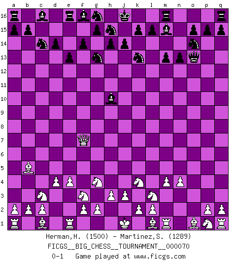 Last move : 0-1 2010 October 10 9:30:53 [Event "FICGS__BIG_CHESS__TOURNAMENT__000070"] [Site "FICGS"] [Date "2010.08.12"] [Round "1"] [White "Herman,Herdiansyah"] [Black "Martinez,Silvio"] [Result "0-1"] [WhiteElo "1500"] [BlackElo "1289"] 1.j2-k4 h15-g13 2.h1-o7 m15-m13 3.o7-c7 j15-k13 4.c7-c15 e15-e13 5.c15-c7 h16-o10 6.h2-g4 o10-o2 7.m2-m4 o2-o13 8.b1-c3 k16-h15 9.n2-n4 p16-o14 10.e2-e4 d15-d14 11.d2-d4 n15-n13 12.f1-b5 l16-m15 13.k1-l3 o16-h10 14.c7-f7 b16-c14 15.g1-f3 f15-f14 0-1 This big chess game has been lost on time (started : 2010.08.12 3:10:4) Follow this game move after move (download)The beauty of a move lies not in its' appearance but in the thought behind it. (Siegbert Tarrasch) Ich verstehe mehr vom Schach als irgendein anderer lebender Meister. (José Raúl Capablanca) El Ajedrez lo es todo: arte, ciencia y deporte. (Anatoly Karpov) Dieu déplace le joueur, et celui-ci la pièce. Quel Dieu derrière Dieu commence donc la trame ? Arturo Perez-Reverte (prix de littérature policière 1993). The best weapon against an enemy is another enemy. (Friedrich Nietzsche)
