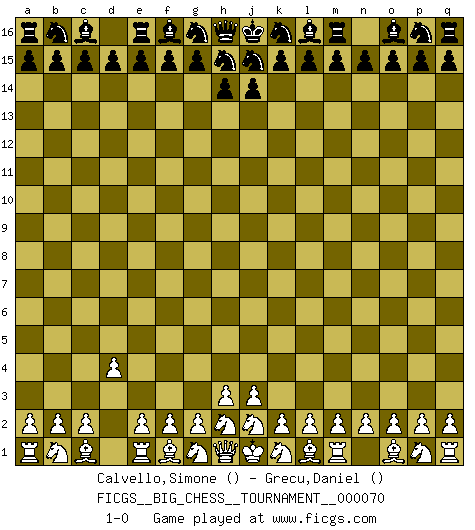 Last move : 1-0 2010 September 11 20:41:21 [Event "FICGS__BIG_CHESS__TOURNAMENT__000070"] [Site "FICGS"] [Date "2010.08.12"] [Round "1"] [White "Calvello,Simone"] [Black "Grecu,Daniel"] [Result "1-0"] [WhiteElo ""] [BlackElo ""] 1.d2-d4 1-0 This big chess game has been lost on time (started : 2010.08.12 3:10:4) Follow this game move after move (download)Chess is really ninety nine percent calculation. (Soltis) Vom Schach wurde gesagt das Leben sei dafür nicht lange genug. Aber das ist der Fehler des Lebens, nicht des Schach'. (Irving Chernev) Aquellos que dicen entender al Ajedrez, no entienden nada. (Robert Hubner) Des idées, des idées, j'en ai cent, j'en ai mille. Des bonnes, des mauvaises, applicables, irréalisables... Il suffit de faire le tri ! (Roos) A mistake is only a mistake if you let it happen twice. Otherwise it is a learning experience. (Daniel Parmet)