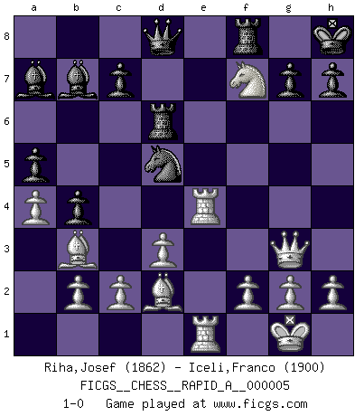 Last move : 1-0 2006 November 25 16:30:4 [Event "FICGS__CHESS__RAPID_A__000005"] [Site "FICGS"] [Date "2006.11.16"] [Round "1"] [White "Riha,Josef"] [Black "Iceli,Franco"] [Result "1-0"] [WhiteElo "1862"] [BlackElo "1900"] 1.e4 e5 2.Nf3 Nc6 3.Bb5 a6 4.Ba4 Nf6 5.O-O b5 6.Bb3 Be7 7.Re1 O-O 8.a4 b4 9.d3 Bb7 10.Nbd2 d5 11.exd5 Nxd5 12.Nc4 Bc5 13.Ncxe5 Nxe5 14.Nxe5 Qh4 15.Qf3 Rad8 16.Bd2 Rd6 17.Re4 Qd8 18.Qh3 Ba7 19.Qg3 a5 20.Rae1 Kh8 21.Nxf7+ 1-0 Ruy Lopez : 5.O-O Kingside Castling by player White (move 5) Kingside Castling by player Black (move 7) Player White won this chess game. Follow this game move after move (download)Look at Garry Kasparov. After he loses, invariably he wins the next game. He just kills the next guy. That's something that we have to learn to be able to do. (Maurice Ashley) Wenn Du absolut nicht mehr weißt, was Du tun sollst, dann ist es Zeit für Panik. (John van der Wiel) Siempre es mucho mejor sacrificar las piezas de tu oponente. (Savielly Tartakover) Horreur, mais aussi harmonie suprême : qu'y avait-il en effet au monde en dehors des échecs ? Le brouillard, l'inconnu, le non-être... (Vladimir Nabokov) They say poker is a zero-sum game. It must be, because every time I play my sum ends up zero. (Max Shapiro)