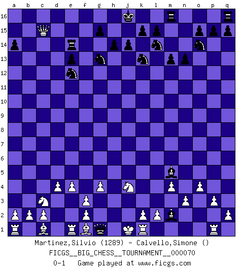 Last move : 0-1 2010 September 12 1:50:4 [Event "FICGS__BIG_CHESS__TOURNAMENT__000070"] [Site "FICGS"] [Date "2010.08.12"] [Round "1"] [White "Martinez,Silvio"] [Black "Calvello,Simone"] [Result "0-1"] [WhiteElo "1289"] [BlackElo ""] 1.j2-k4 j15-k13 2.h1-o7 m15-m13 3.o7-f15 g16-f14 4.f15-c12 b16-c14 5.h2-g4 d15-d13 6.c12-c9 e15-e13 7.m2-m4 n15-n13 8.e2-e4 p16-o14 9.g1-f3 h15-g13 10.k1-l3 k16-l14 11.c9-c10 f14-e12 12.n2-n3 a15-a14 13.o1-d11 o16-f8 14.b1-c3 f8-k4 15.j3-k4 h16-p9 16.p2-p3 p9-k4 17.l1-m2 f16-a11 18.l3-j4 k4-o8 19.p1-q3 c16-q3 20.c10-b11 a11-b12 21.b11-d13 q3-p2 22.q1-p1 p2-o3 23.m1-l1 a16-d16 24.d13-b11 b12-m2 25.l1-k1 l16-p12 26.b11-b15 d16-d11 27.b15-c14 e16-e14 28.c14-c15 p12-g4 29.h3-g4 d11-f11 30.d2-d4 o3-m5 31.o2-o4 f11-f3 32.g2-f3 o8-g1 0-1 Follow this game move after move (download)A great player and a great example for many. His book My 60 Memorable Games had a big impact on me. It is a shame he didn't continue to enrich the world of chess with his unparalleled understanding after 1972. (Jan Timman, about Bobby Fischer's death) Ich bin es gewohnt, das die Jugend mir überhaupt keinen Respekt entgegenbringt. (Alexander Morozewich) Las piezas de Ajedrez son los bloques del alfabeto que moldean los pensamientos; y esos pensamientos, aunque hagan un diseño visual en el tablero, expresan abstractamente su belleza como un poema. (Marcel Duchamp) Les échecs, c'est la lutte contre l'erreur. (Johannes Zukertort) Life is painting a picture, not doing a sum. (Oliver Wendell Holmes, Jr.)