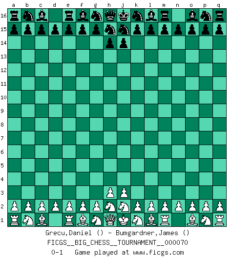 Last move : 0-1 2010 September 11 11:28:49 [Event "FICGS__BIG_CHESS__TOURNAMENT__000070"] [Site "FICGS"] [Date "2010.08.12"] [Round "1"] [White "Grecu,Daniel"] [Black "Bumgardner,James"] [Result "0-1"] [WhiteElo ""] [BlackElo ""] 0-1 This big chess game has been lost on time (started : 2010.08.12 3:10:4) Follow this game move after move (download)During a Chess competition a Chessmaster should be a combination of a beast of prey and a monk. (Alexander Alekhine) Die FIDE ist dabei in die Hände der russischen Mafia zu fallen. (Larry Evans) No existe un remordimiento como el remordimiento del Ajedrez. (H. G. Wells) Les Echecs, c'est l'art de la guerre sans les charniers, c'est la résurrection des morts tombés au champ d'honneur, l'espoir perpétuel, la suprématie de l'intelligence sur la force, la culture de l'esprit. (F. Szpiner) Man with more than one clock never knows what time it is. (Chinese thought)
