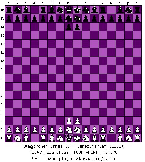 Last move : 0-1 2010 August 22 5:11:21 [Event "FICGS__BIG_CHESS__TOURNAMENT__000070"] [Site "FICGS"] [Date "2010.08.12"] [Round "1"] [White "Bumgardner,James"] [Black "Jerez,Miriam"] [Result "0-1"] [WhiteElo ""] [BlackElo "1386"] 0-1 Follow this game move after move (download)The passed Pawn is a criminal, who should be kept under lock and key. Mild measures, such as police surveillance, are not sufficient. (Aaron Nimzovich) Pläne sind die Träume des Verständigen. (Ernst Freiherr von Feuchtersleben) Debemos de asegurarnos de que el Ajedrez no se convierta en un lenguaje muerto, muy interesante, pero solo para un grupo muy pequeño. (Sytze Faber) Il vaut mieux sacrifier les pièces de l'adversaire. (Xavier Tartacover) Just because you do not take an interest in politics doesn't mean politics won't take an interest in you. (Pericles 430 B.C.)