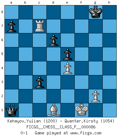 Last move : 0-1 2010 September 10 22:51:57 [Event "FICGS__CHESS__CLASS_F__000086"] [Site "FICGS"] [Date "2010.08.12"] [Round "1"] [White "Kehayov,Yulian"] [Black "Quanter,Kirsty"] [Result "0-1"] [WhiteElo "1200"] [BlackElo "1054"] 1.e4 e5 2.c4 d6 3.d4 f6 4.dxe5 fxe5 5.Bd3 Nf6 6.Nf3 Bg4 7.h3 Bxf3 8.Qxf3 g6 9.O-O h5 10.Nd2 Bh6 11.Qe2 O-O 12.Nf3 Bxc1 13.Raxc1 c5 14.b3 Nc6 15.a3 g5 16.Nxg5 Nd4 17.Qc2 Nxc2 18.Rxc2 Ng4 19.Ne6 Qe7 20.Nxf8 Rxf8 21.hxg4 hxg4 22.Be2 Qg5 23.f3 gxf3 24.Bxf3 Qe3+ 25.R1f2 Qxb3 26.Rb2 Qxc4 27.Rxb7 Qc1+ 28.Rf1 Qxa3 29.Rd7 c4 30.Rc7 c3 31.Bd1 Rxf1+ 32.Kxf1 Qa1 0-1 King's pawn game Kingside Castling by player White (move 9) Kingside Castling by player Black (move 11) Player Black won this chess game. Follow this game move after move (download)A good sacrifice is one that is not necessarily sound but leaves your opponent dazed and confused. (Rudolph Spielmann) Bis jetzt ist Weiß einer wohlbekannten Analyse gefolgt. Aber jetzt begeht er einen schrecklichen Fehler: Er beginnt seinen eigenen Kopf zu benutzen. (Siegbert Tarrasch) Un mal día en el Ajedrez, es mejor que cualquier buen día en el trabajo. (Anonymous) Les échecs sont utiles à l'exercice de la faculté de penser et à celle de l'imagination. Car nous devons posséder une méthode élaborée pour atteindre des buts partout où nous devons conduire notre raison. (Leibnitz) The faster the computer, the slower the brain. (Thibault de Vassal)