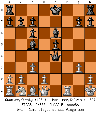 Last move : 0-1 2010 September 12 23:10:24 [Event "FICGS__CHESS__CLASS_F__000086"] [Site "FICGS"] [Date "2010.08.12"] [Round "1"] [White "Quanter,Kirsty"] [Black "Martinez,Silvio"] [Result "0-1"] [WhiteElo "1054"] [BlackElo "1190"] 1.e4 e5 2.Nf3 Nc6 3.Bb5 Nf6 4.Bxc6 dxc6 5.Nxe5 Nxe4 6.f3 f6 7.fxe4 fxe5 8.O-O Bc5+ 9.Kh1 Be6 10.c3 Qh4 11.g3 Qxe4+ 0-1 Ruy Lopez : Berlin defense Kingside Castling by player White (move 8) Player Black won this chess game. Follow this game move after move (download)What is the difference between chess and football? Everybody understands football, but nobody plays it. Everybody plays chess, but nobody understands it. Everything is relative. (Vladimir Kramnik) Der Freibauer hat für mich eine Seele, genau wie der Mensch, Wünsche, die unerkannt in ihm schlummern, und Befürchtungen, von deren Existenz er selbst kaum ahnt. (Aaron Nimzowitsch) Yo jugué Ajedrez con el y a veces le pude haber ganado solo que siempre devuelve su última jugada y juega la partida de manera diferente. (Mark Twain) On est toujours la mazette de quelqu'un d'autre. (Anonyme) The only thing that overcomes hard luck is hard work. (Harry Golden)