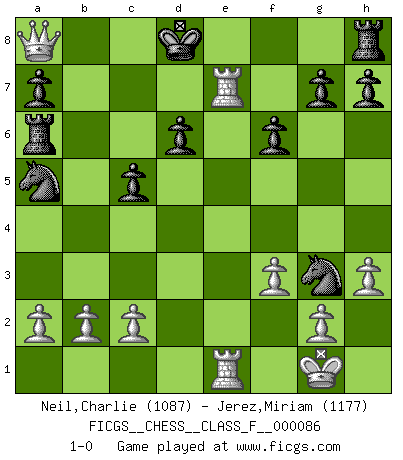 Last move : 1-0 2010 September 12 12:29:44 [Event "FICGS__CHESS__CLASS_F__000086"] [Site "FICGS"] [Date "2010.08.12"] [Round "1"] [White "Neil,Charlie"] [Black "Jerez,Miriam"] [Result "1-0"] [WhiteElo "1087"] [BlackElo "1177"] 1.e4 e5 2.Nf3 Nc6 3.d4 d6 4.Bb5 Bd7 5.d5 Na5 6.Bxd7+ Qxd7 7.O-O Nf6 8.Nc3 c6 9.h3 Be7 10.dxc6 Qxc6 11.Bg5 Nxe4 12.Bxe7 Kxe7 13.Nd5+ Kd7 14.Nxe5+ Ke8 15.Nxc6 bxc6 16.Nc7+ Kd7 17.Na6 c5 18.f3 Ng3 19.Re1 Rac8 20.Qd5 f6 21.Re6 Rc6 22.Rae1 Rxa6 23.Re7+ Kd8 24.Qa8+ 1-0 Scotch Opening Kingside Castling by player White (move 7) Player White won this chess game. Follow this game move after move (download)Chess is mental torture. (Garry Kasparov) Wir können eben der zündenden Macht des Opfers nicht wiederstehen, denn die Begeisterung für das Opfer liegt in der Natur des Menschen. (Rudolf Spielmann) Observen a Garry Kasparov. Después de una derrota, invariablemente el gana la próxima partida. Prácticamente hace pedazos a su siguiente oponente. Eso es algo que tenemos que aprender a lograr. (Maurice Ashley) Le plus grand jeu de l'esprit jamais inventé, plus vous l'apprenez, plus vous y prenez du plaisir. (Garry Kasparov) I couldn't make any sense out of what this particular thread is about. It sounds like R2 D2 computer speaking. A space fight ?!? Some 'command' problems in Moscow ? Some killers & narcotic addicts attacking some game & a god wannabe ?? (Dinesh De Silva, lost in a russian conflict in FICGS forum)
